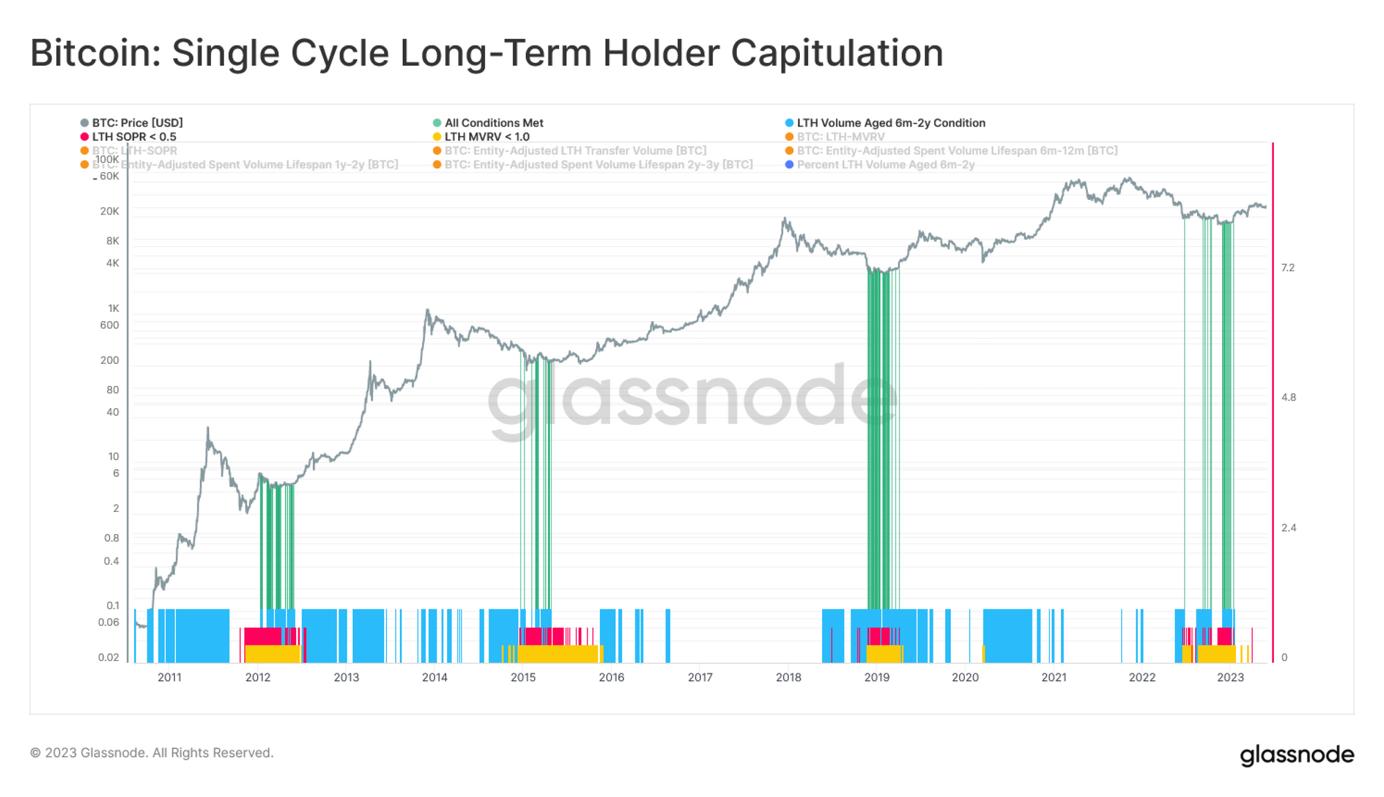 The chart below shows the total spent volume in loss attributed to LTHs. Periods where the above unrealized stress condition is hit (LTH-MVRV < 1.0) are marked in red. Whilst individual investors can, and do capitulate throughout the entire bear market, it is immediately clear that this flush-out reaches a crescendo right at the bitter end.
