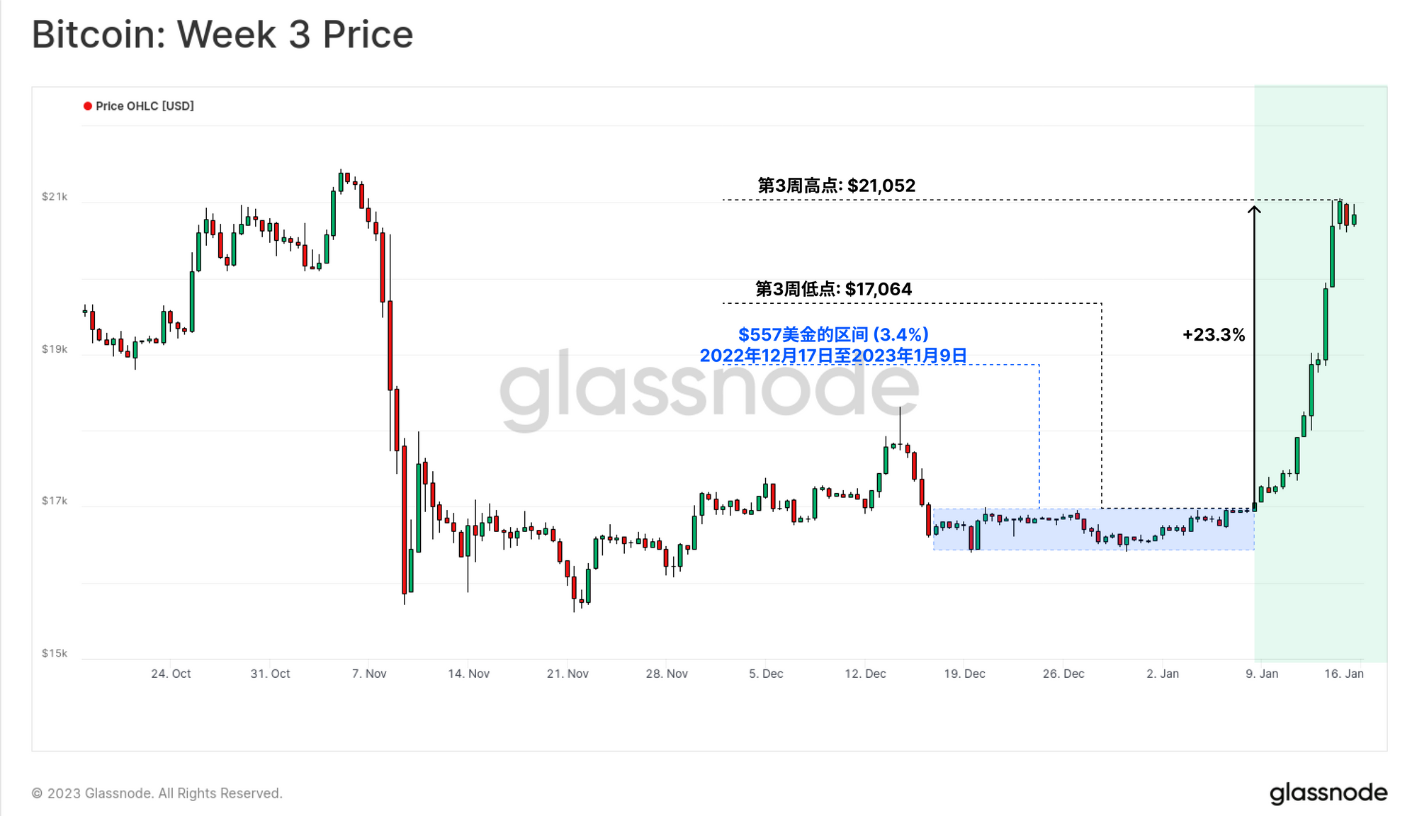 在经历了比特币历史上波动最小的时期之一(第2周链上周报)后,市场在本周拉开了一个非凡的、爆炸性的反弹,涨幅达到23.3%。比特币价格从17000美元的周低点反弹到21000美元以上,突破了几个被广泛认可的技术和链上定价模型。这些模型中的大多数往往在熊市期间充当重要的心理阻力位,因此,此次突破事件值得我们注意。