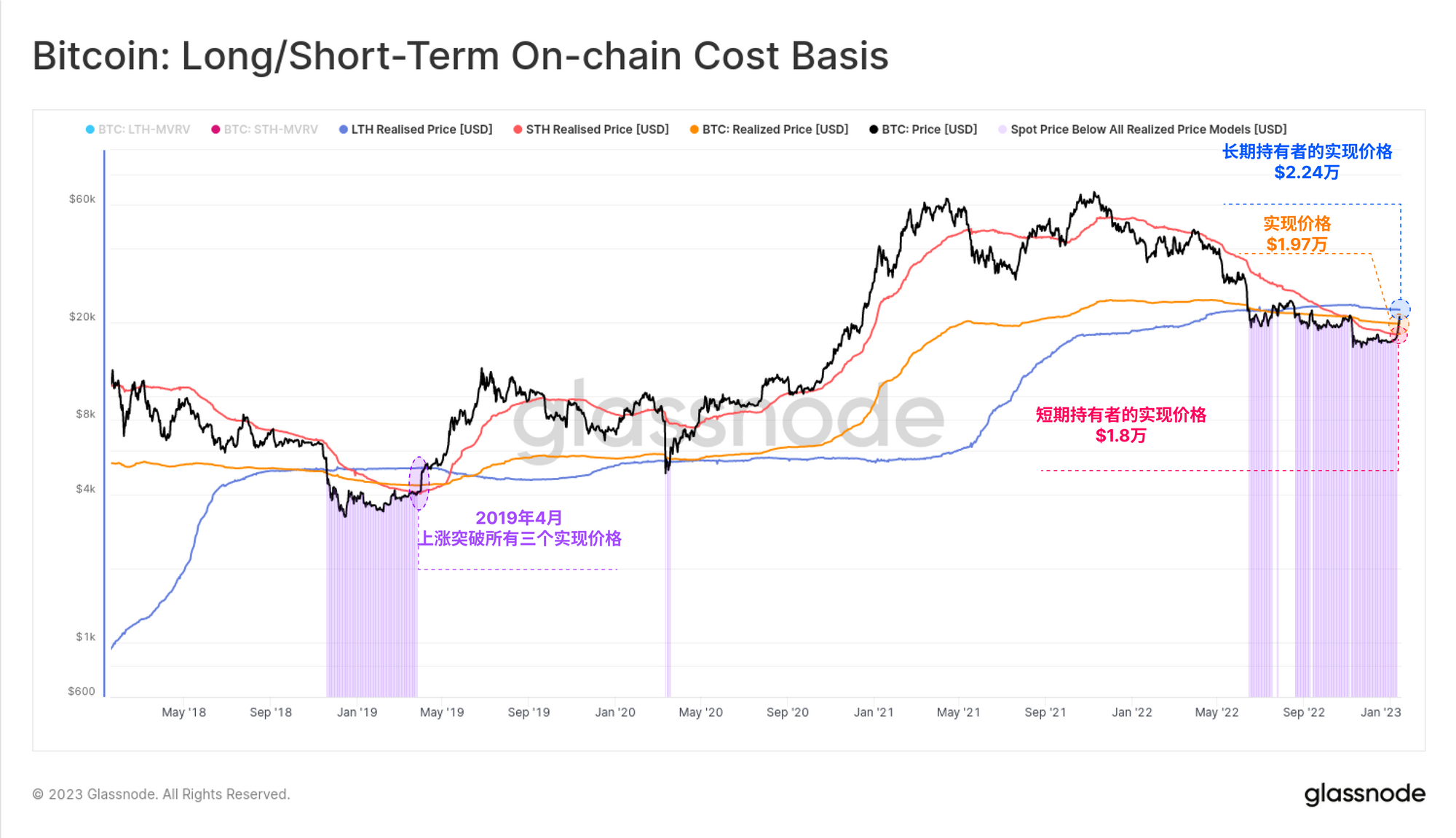 1. 市场强度与2019年4月观察到的市场强度有明显的相似性,尽管目前的市场尚未突破长期持有者的实现价格。