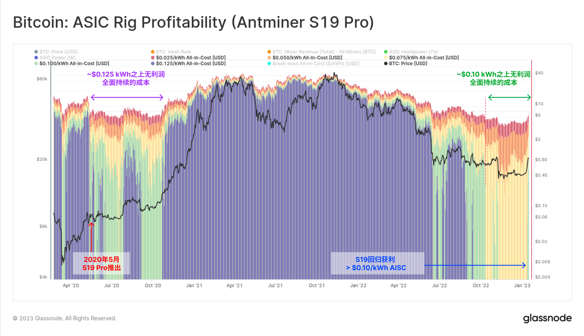 图表为对数轴,该矿机无利可图的时期显示为空白。有两个时期很明显,即2020年5月至10月(紧接着该矿机发布,以及减半事件),以及从2022年7月到本周。通过这个模型,估计在过去7个月里,任何以超过0.10美元/千瓦时的AISC运营S19 Pro的矿工都是无利可图的。