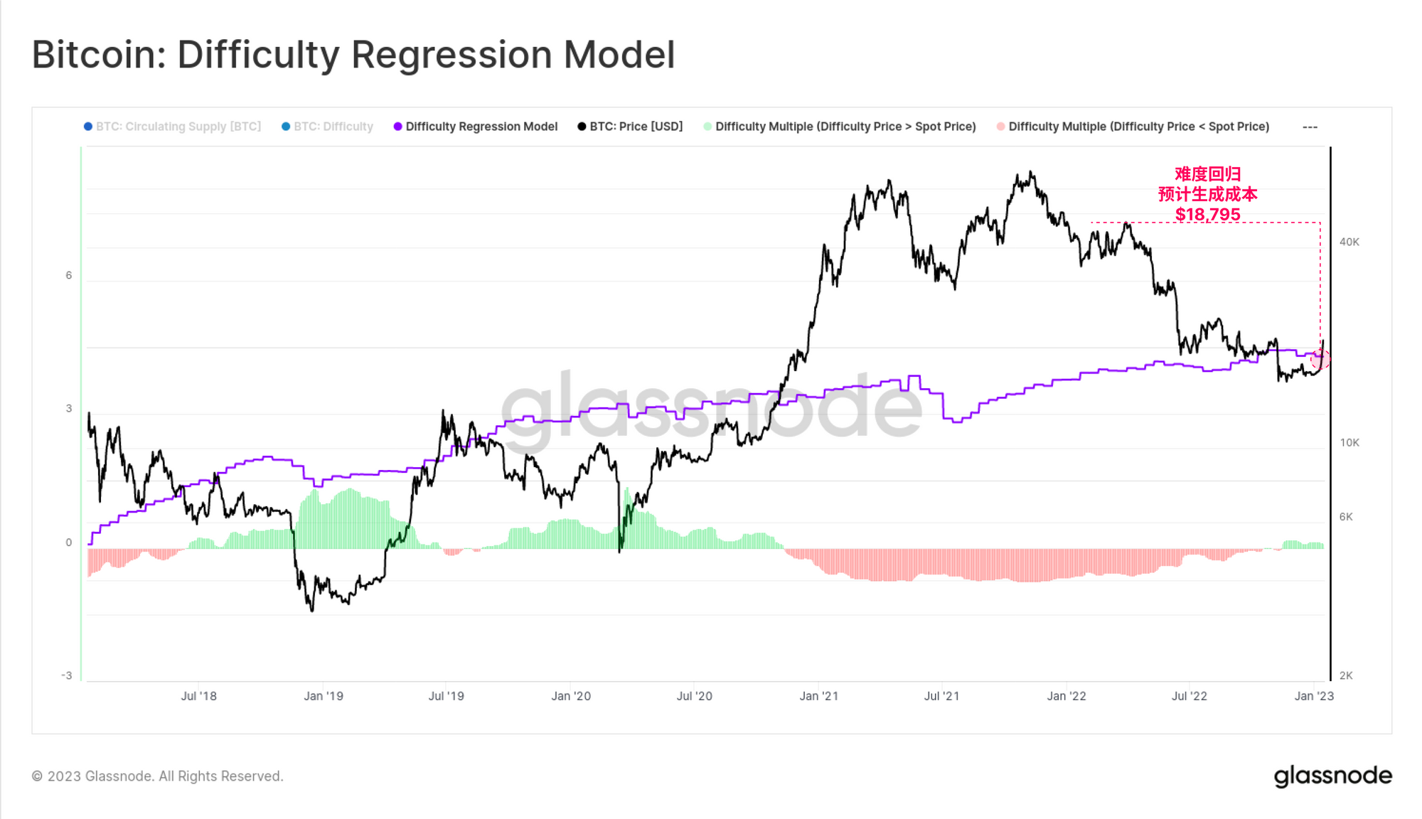 下面的模型估计BTC生产的平均成本为18,798美元,假设挖矿难度反映了挖矿业的最终 "价格"。