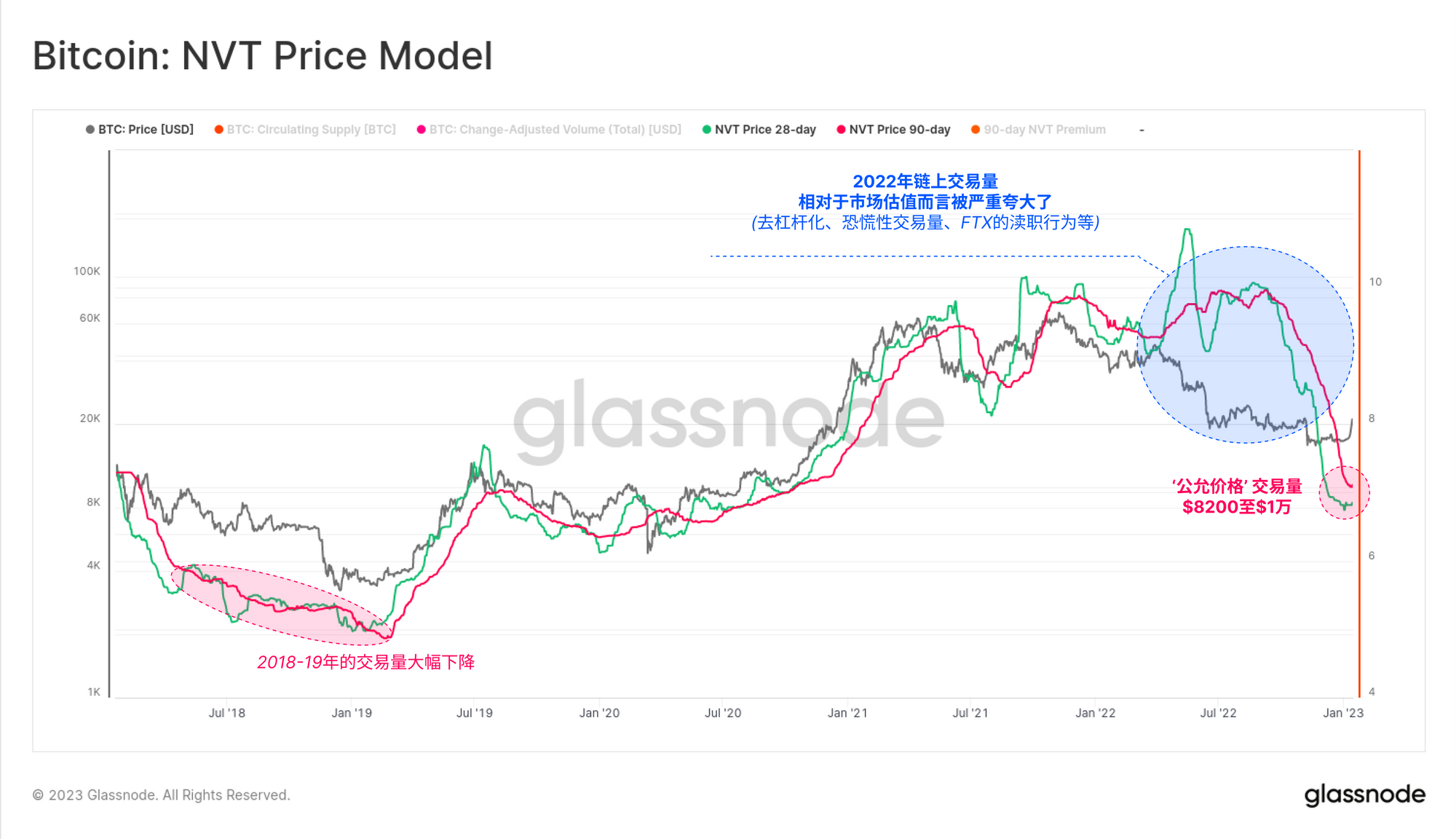 然而,借助于glassnode的实体调整算法,我们可以实现对真正有经济意义的转账量的更准确的表述,从而得出一个更干净的NVT价格模型,与价格的关系明显更强。