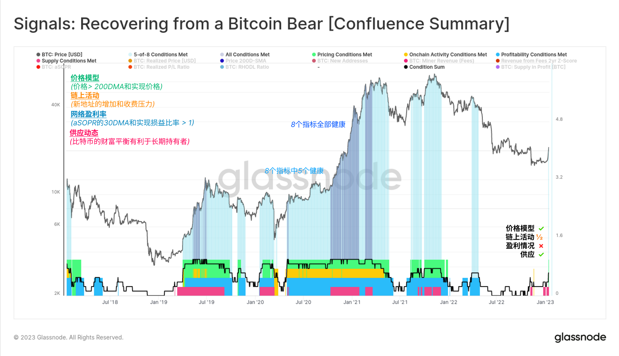 最后,我们最近发布了一个新的 仪表盘设计,目的是在四个核心概念上找到几个链上指标的汇合点。这个模型将历史上标志着熊市强劲复苏的关键水平和观察结果提炼成一个易于使用的可视化工具。