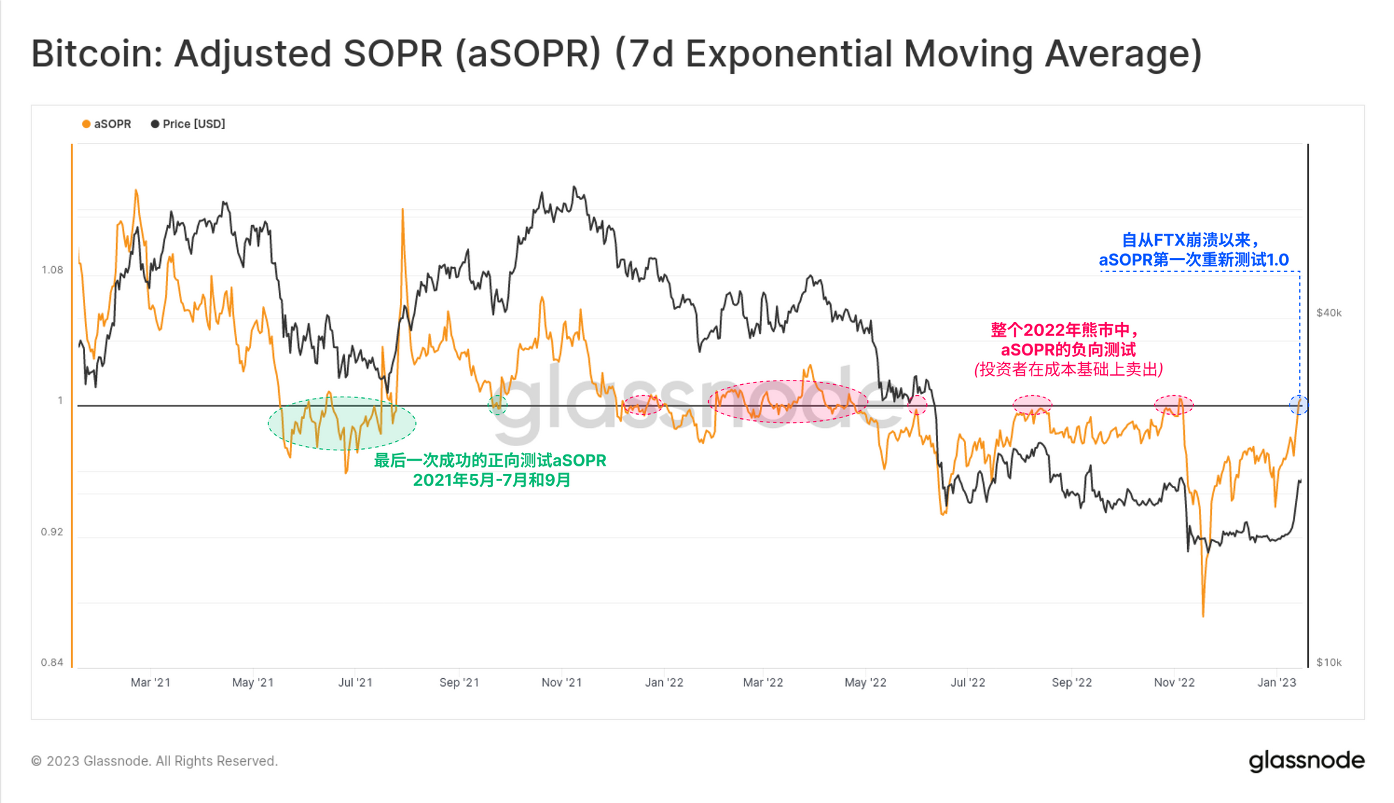 最后一个值得关注的话题是链上盈利交易的回归。aSOPR模型正在从下方重新测试1.0的数值,历史已经证明这是整个熊市中的一个关键阻力水平。