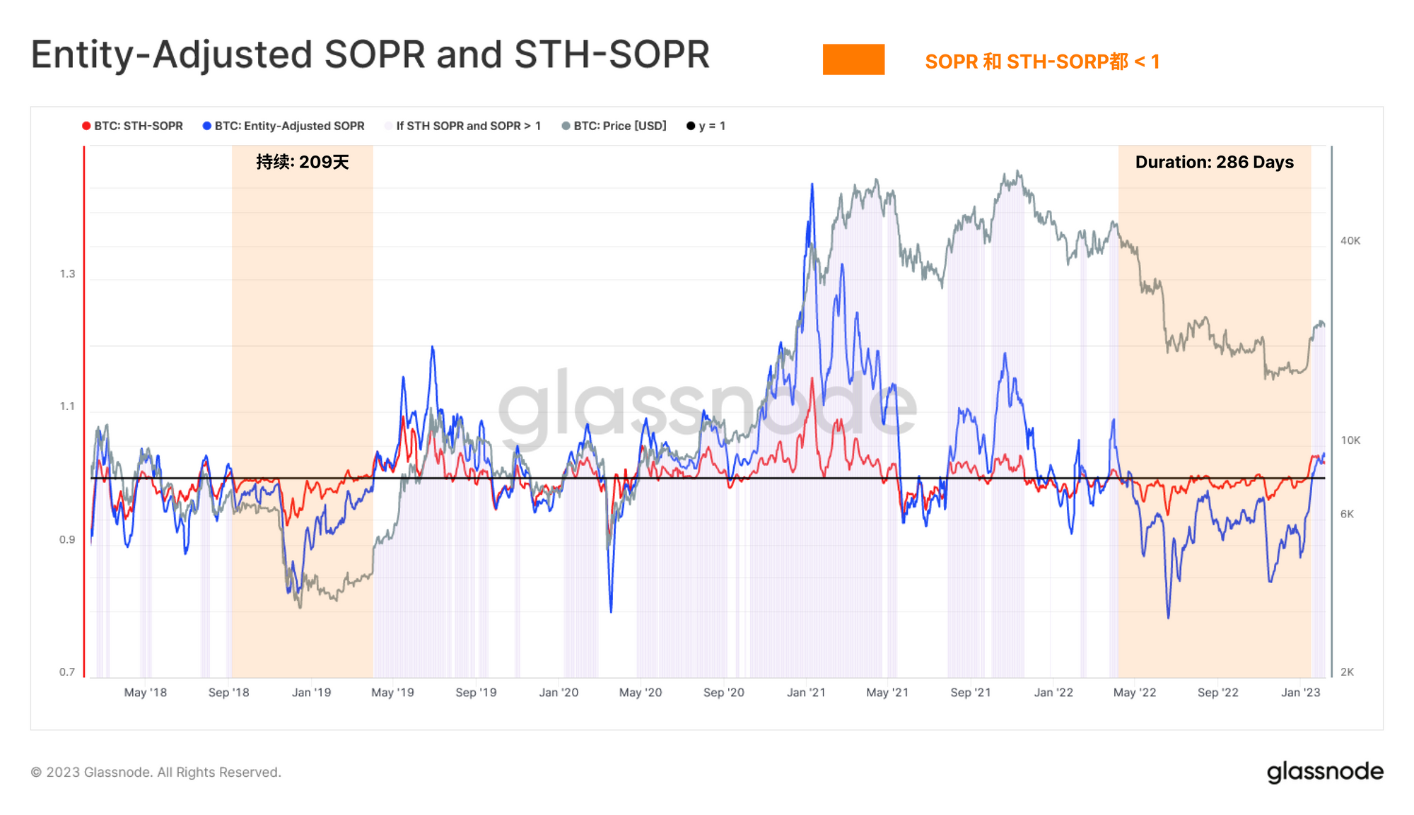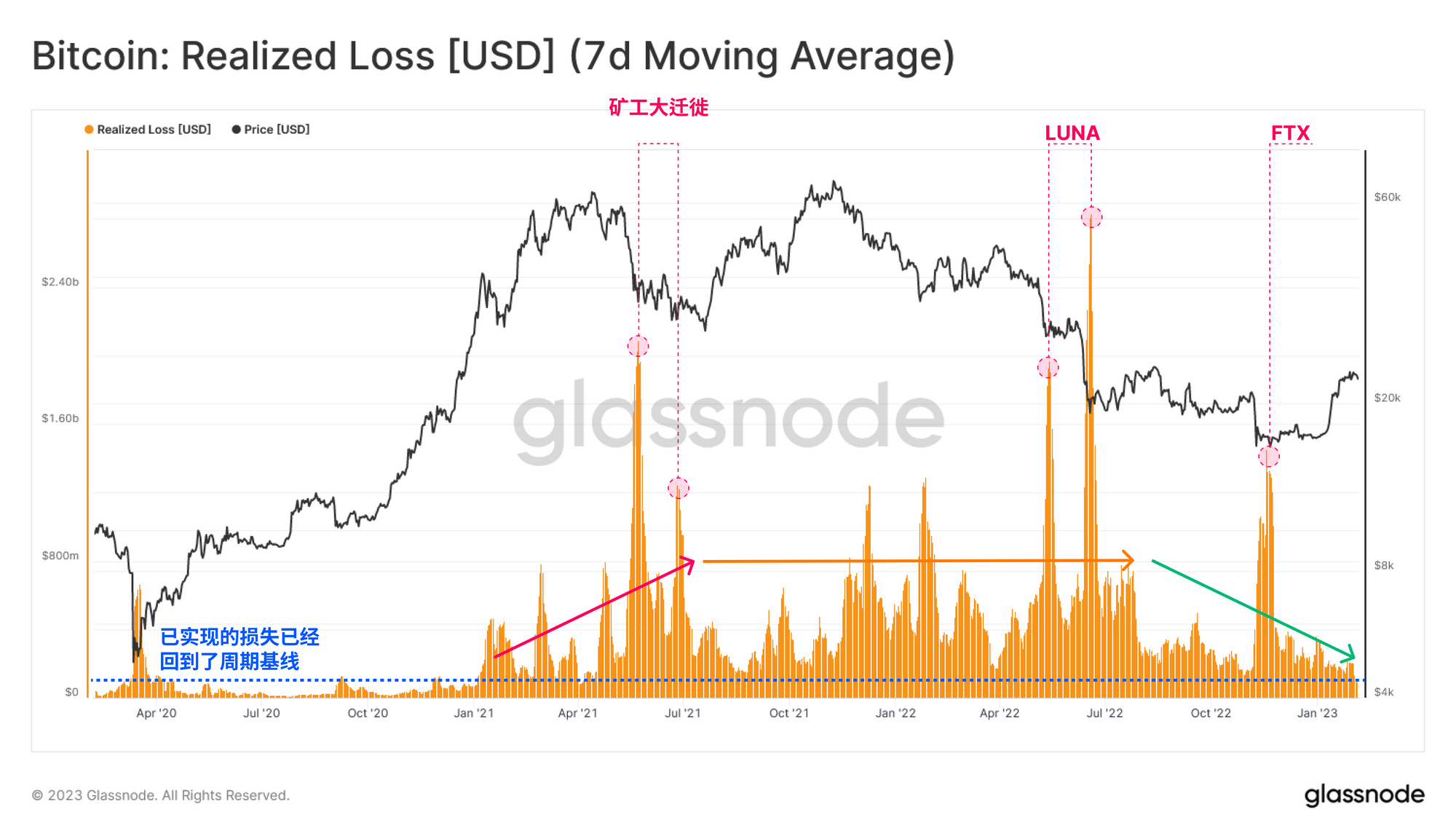 然而,我们可以看到,目前已实现的损失水平已经下降到周期基线的2亿美元/天左右,如果没有明确的投降事件(如LUNA / FTX),损失情况会整体缩小。