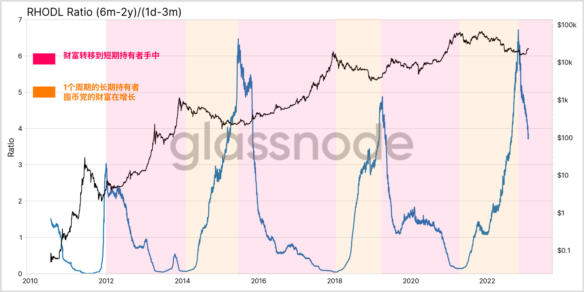 以此为背景,我们可以引入RHODL比率的新变体,即比较单周期长期持有者(6个月-2年)和最年轻的短期持有者(1天-3个月)所持有的财富。这个指标旨在评估跨周期转换的资本轮转的转折点。