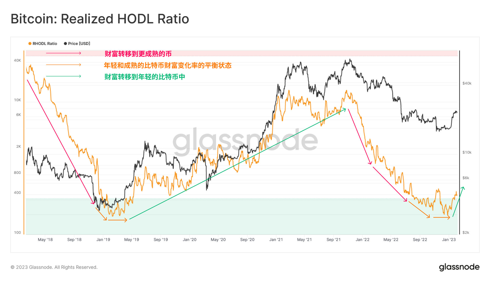 随后,我们可以采用实现的HODL比率 来进一步补充上述观察。这个指标比较了1周和1年-2年旧币之间持有的这种财富平衡,创造了一个宏观规模的振荡器。
