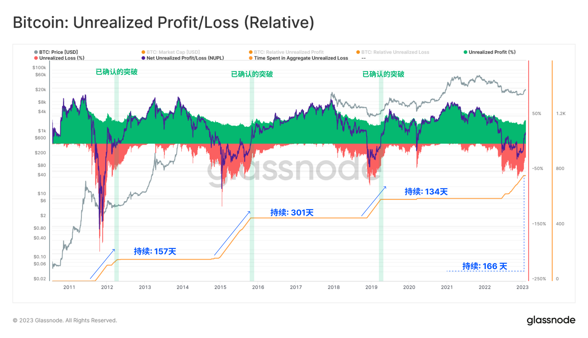比较过去所有熊市中NUPL为负值的持续时间,我们观察到我们目前的周期(166天)与2011-12(157天)和2018-19(134天)熊市之间的历史相似性。2015-16年的熊市在熊市持续时间方面仍然很突出,经历的未实现的损失制度几乎是亚军(2022-23周期)的两倍。