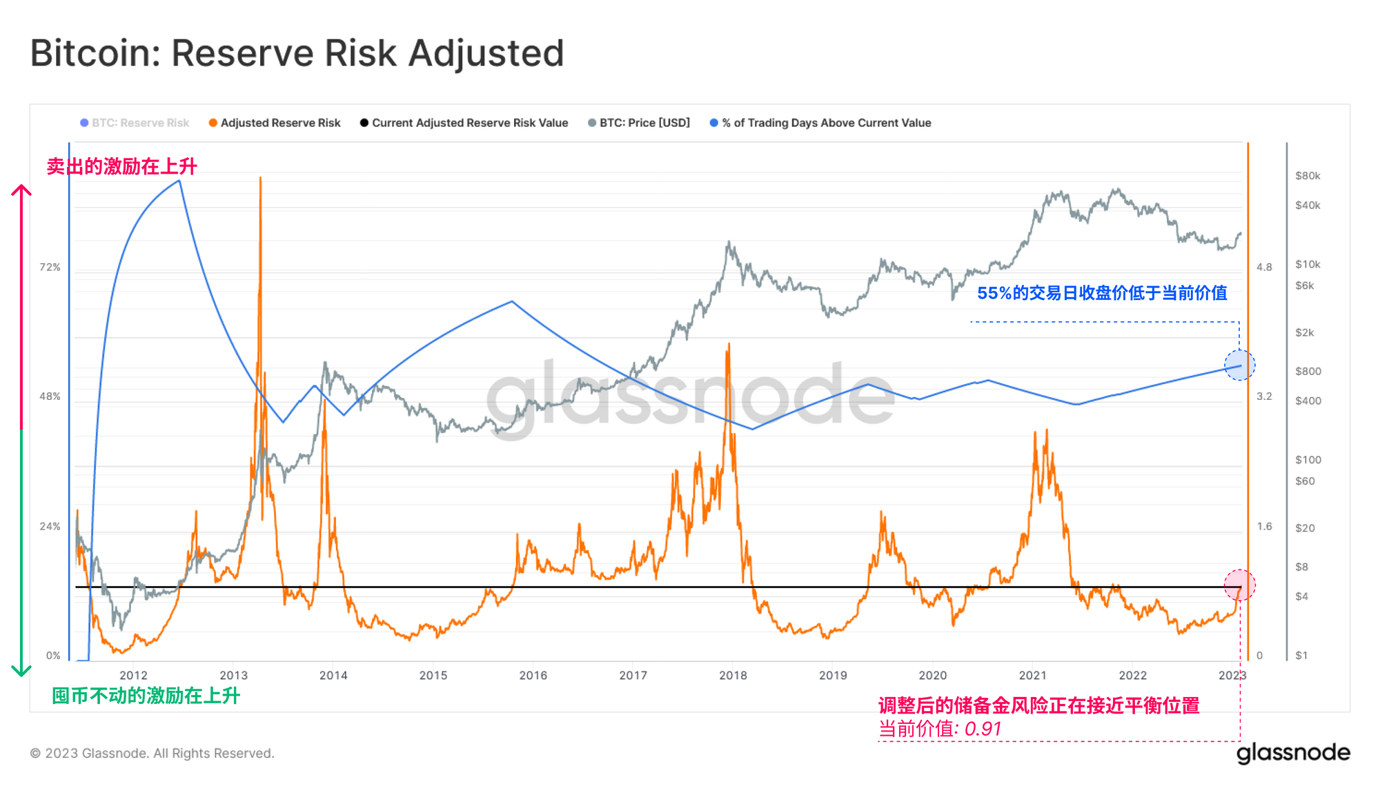 调整后的准备金风险指标可以用来描述囤币党群组的行为。这个周期性震荡器量化了出售的总动力和长期休眠比特币的实际卖出之间的平衡。