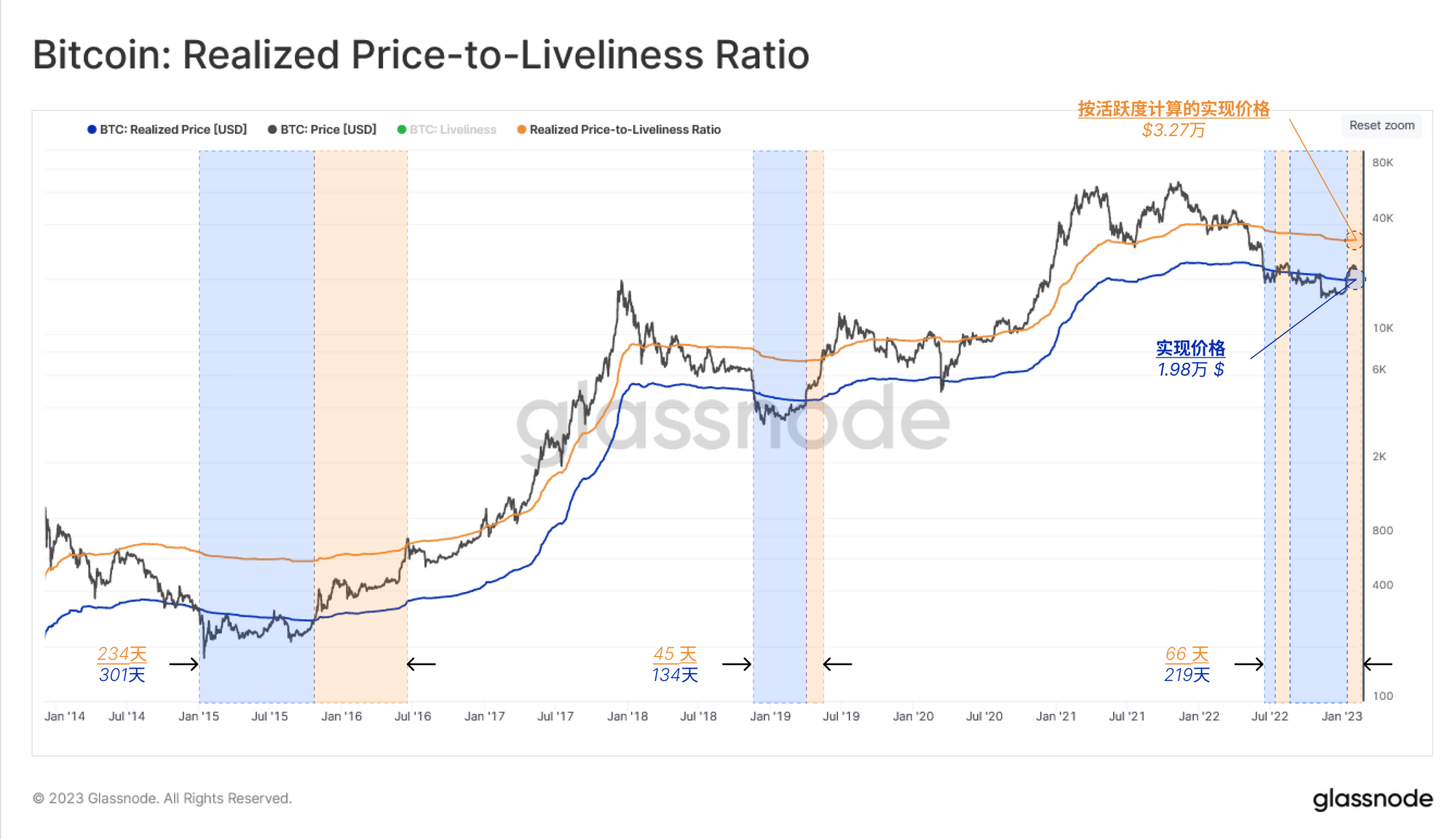 - 这个区域的下限是实现价格🔵(1.98万美元),对应于市场的平均链上收购价格。