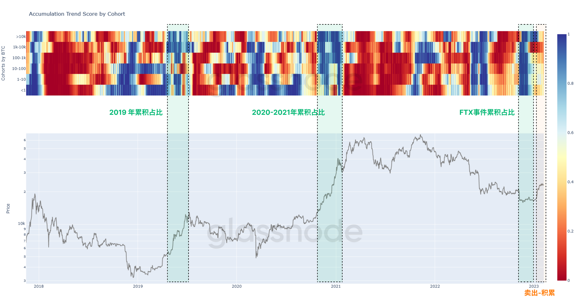 我们可以进一步检查积累趋势得分的组成部分,以提供对各种钱包余额群组的细化分析。我们观察到,最近几周,所有群组的投资者的综合行为都发生了变化,从净积累(FTX投降事件🟩)到卖出中立** 🟧。