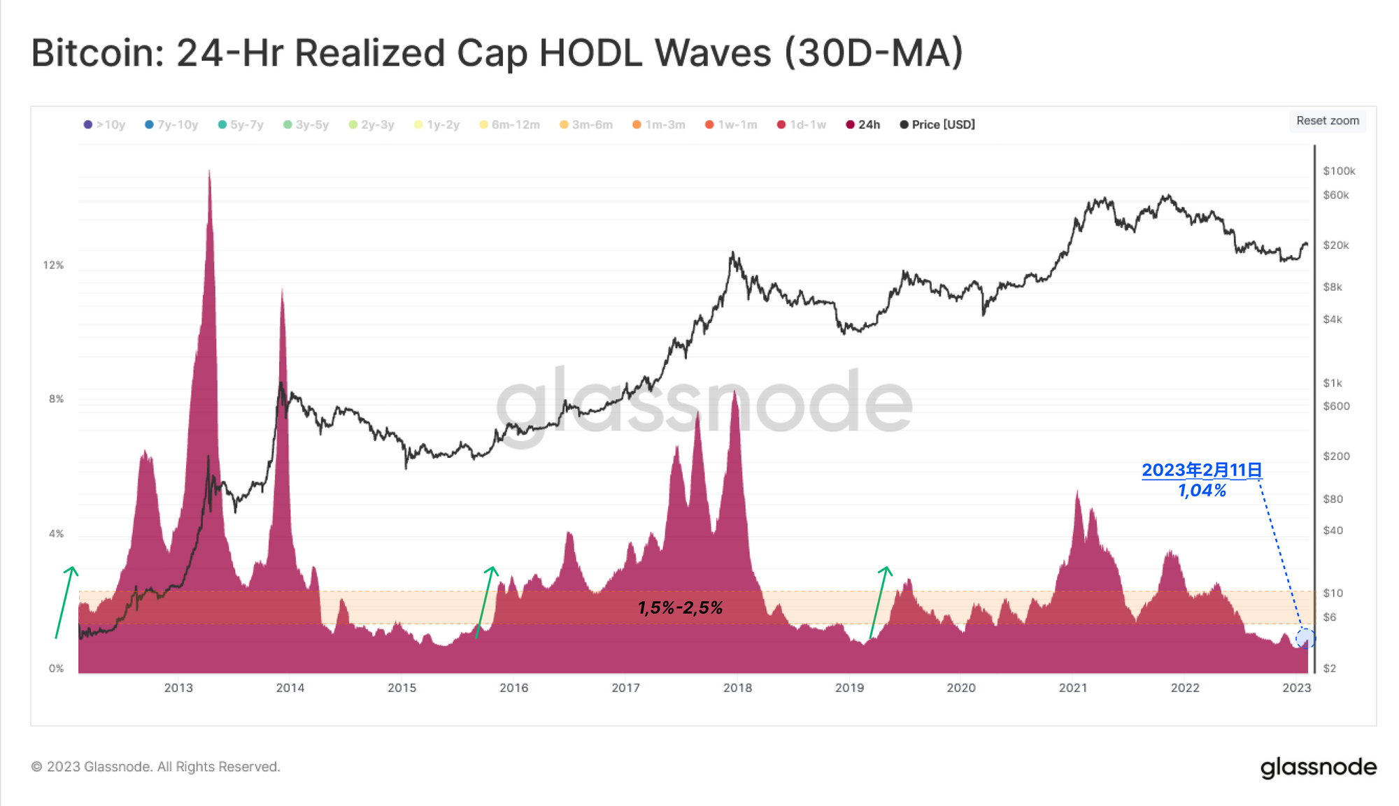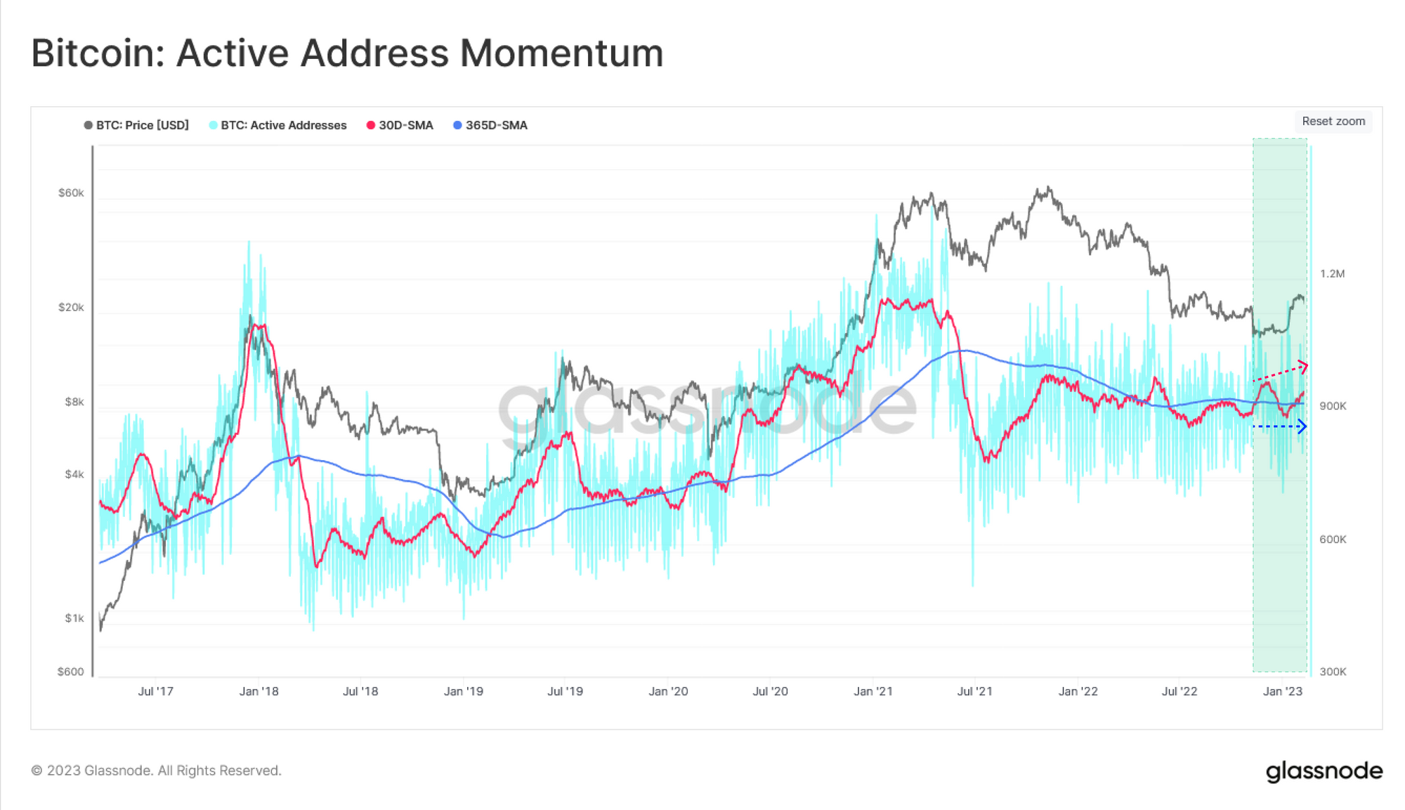 自FTX破产引发的投降事件以来,加入网络的新地址的月平均数已经超过了年平均数,这是一个建设性的迹象。这个指标在本周出现了第二次大幅上升,然而,长期移动平均线仍处于横盘,表明这种活动的上升仍处于起步阶段。