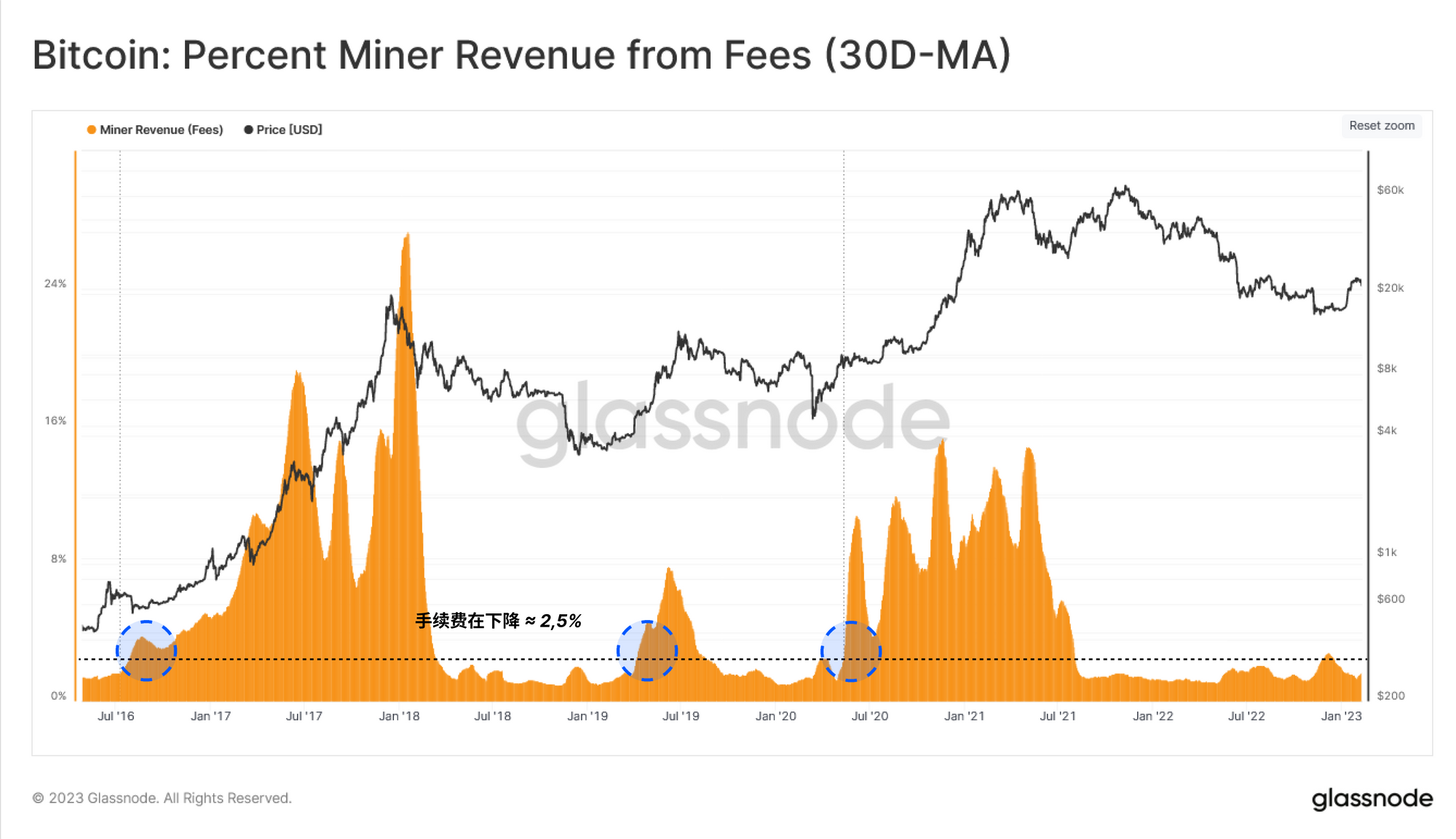 观察每月平均的矿工手续费收入,很明显,这个指标还没有超过熊市手续费底线(2.5%)🔵的显著时间段。