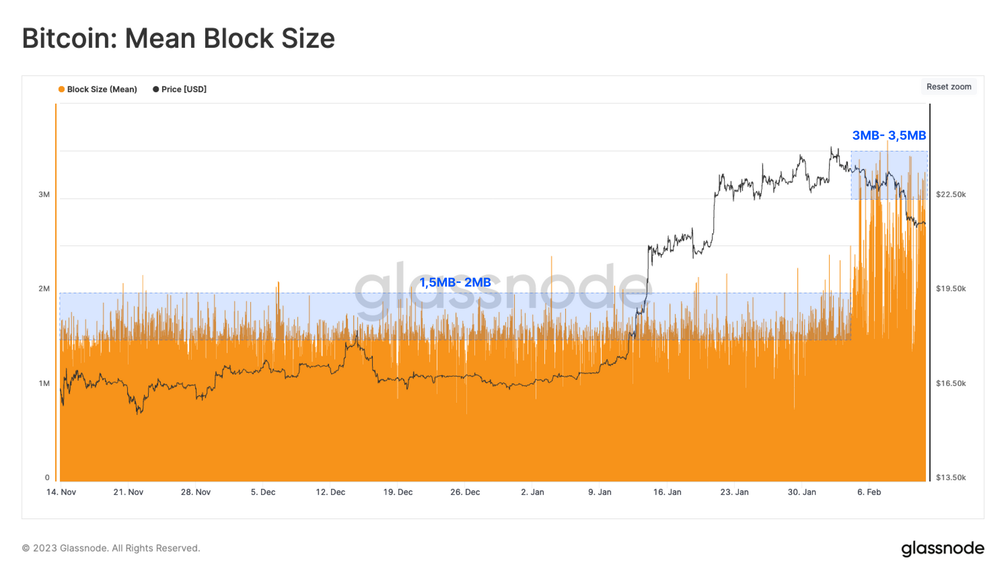 Ordinals对平均区块大小的影响也很明显,平均区块大小的上限范围从稳定的1.5到2.0MB,增加到上周的3.0和3.5MB之间。