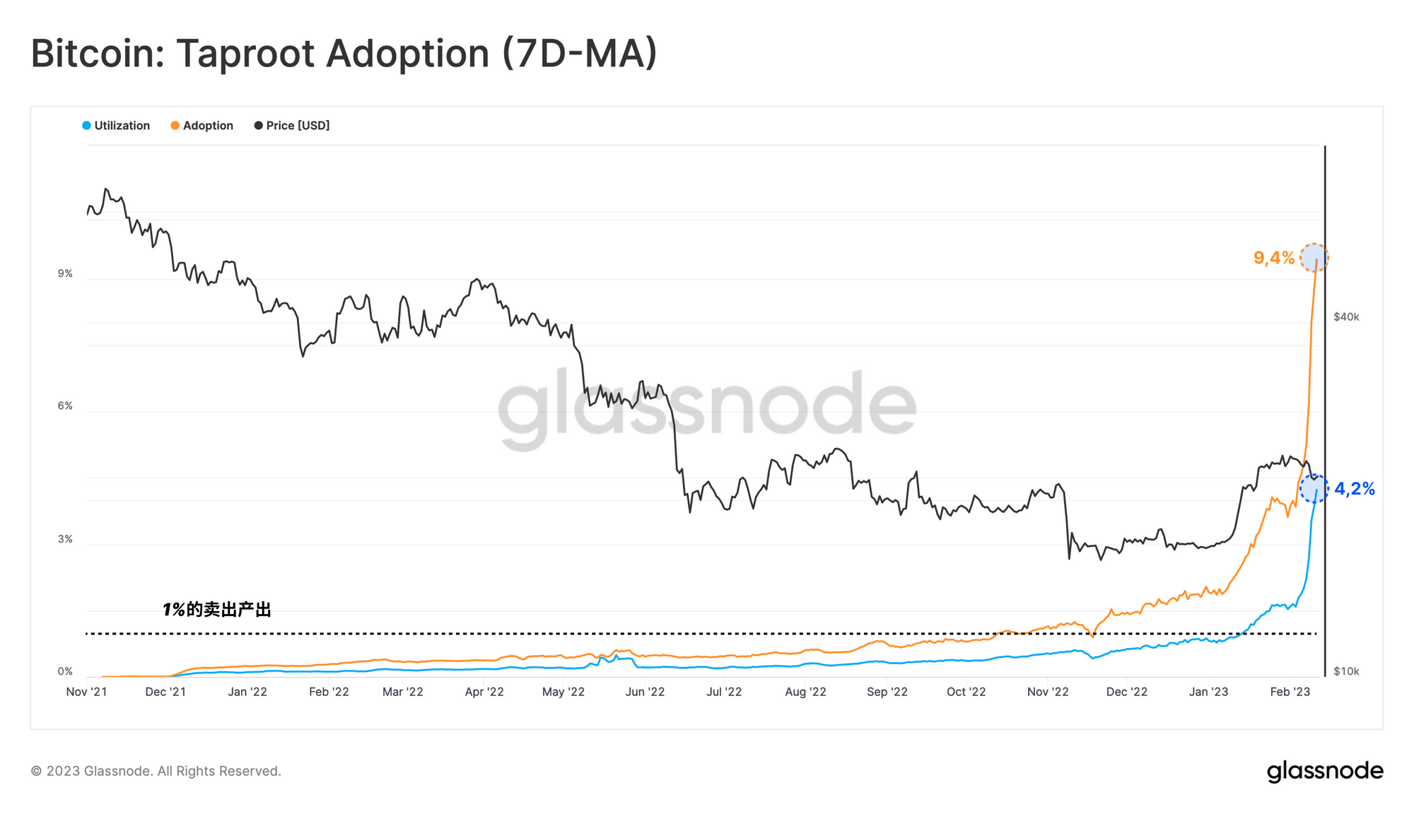 这种新的创新的影响使得Taproot的采用率和使用率分别飙升到9.4%和4.2%的历史最高水平(更多关于采用率和使用率的信息请参见我们的研究文章)。