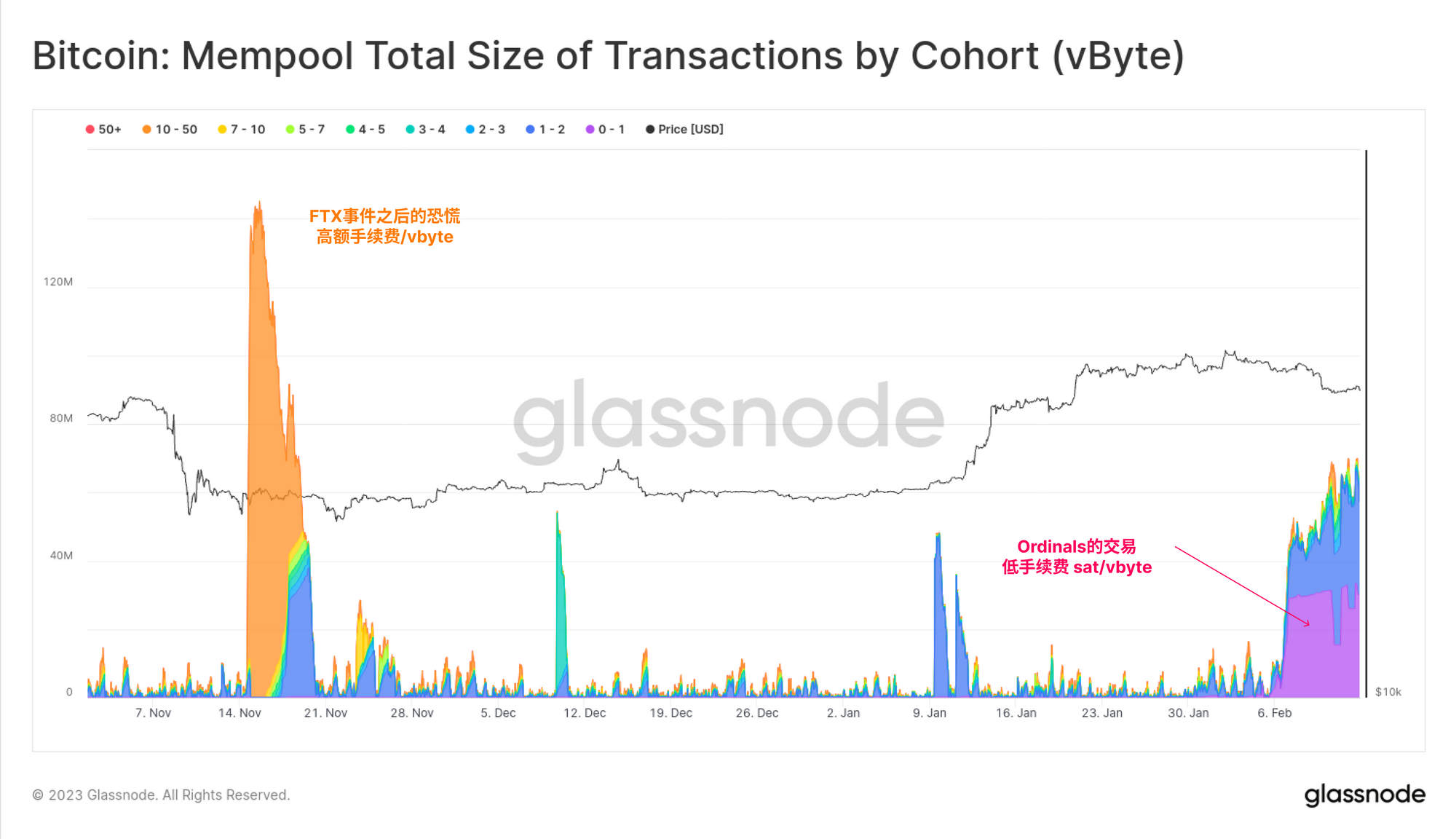 到目前为止,Ordinals的影响是为区块包含所需的交易费用设定了一个新的下限。可以看到大量的低手续费交易(0到1聪/vbyte)涌入我内存池,呈紫色🟣。这与FTX恐慌后的情况不同,当时的内存池充满了高紧迫性、高收费的交易,显示为橙色🟠。
