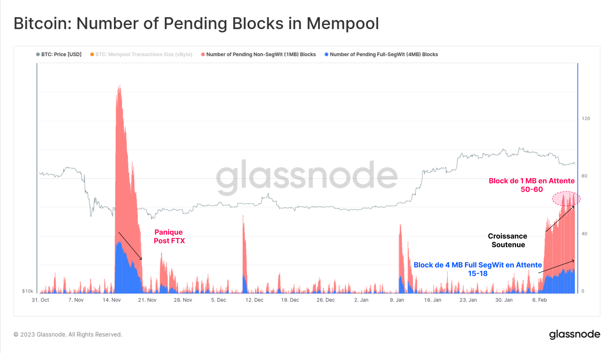 我们还可以模拟出清除mempool所需的待处理块的数量,假设标准的1MB非SegWit交易🔴,以及完整的Seg-Wit 4MB块🔵。我们可以再次注意到与后FTX时期的明显不同,后FTX时期随着恐慌情绪的平息而迅速衰减。在Ordinals的趋势下,我们实际上可以看到对区块空间的需求逐渐增长,过去的一周里一直保持着这种需求。