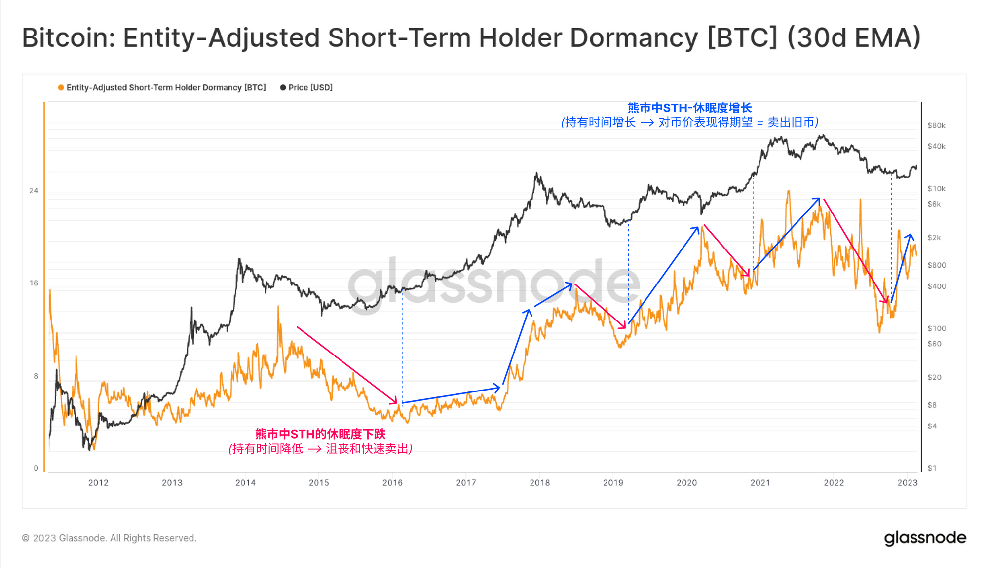 STH-休眠期的急剧上扬表明后一种情况正在发生,因为低点的买家卖出了一些比特币。