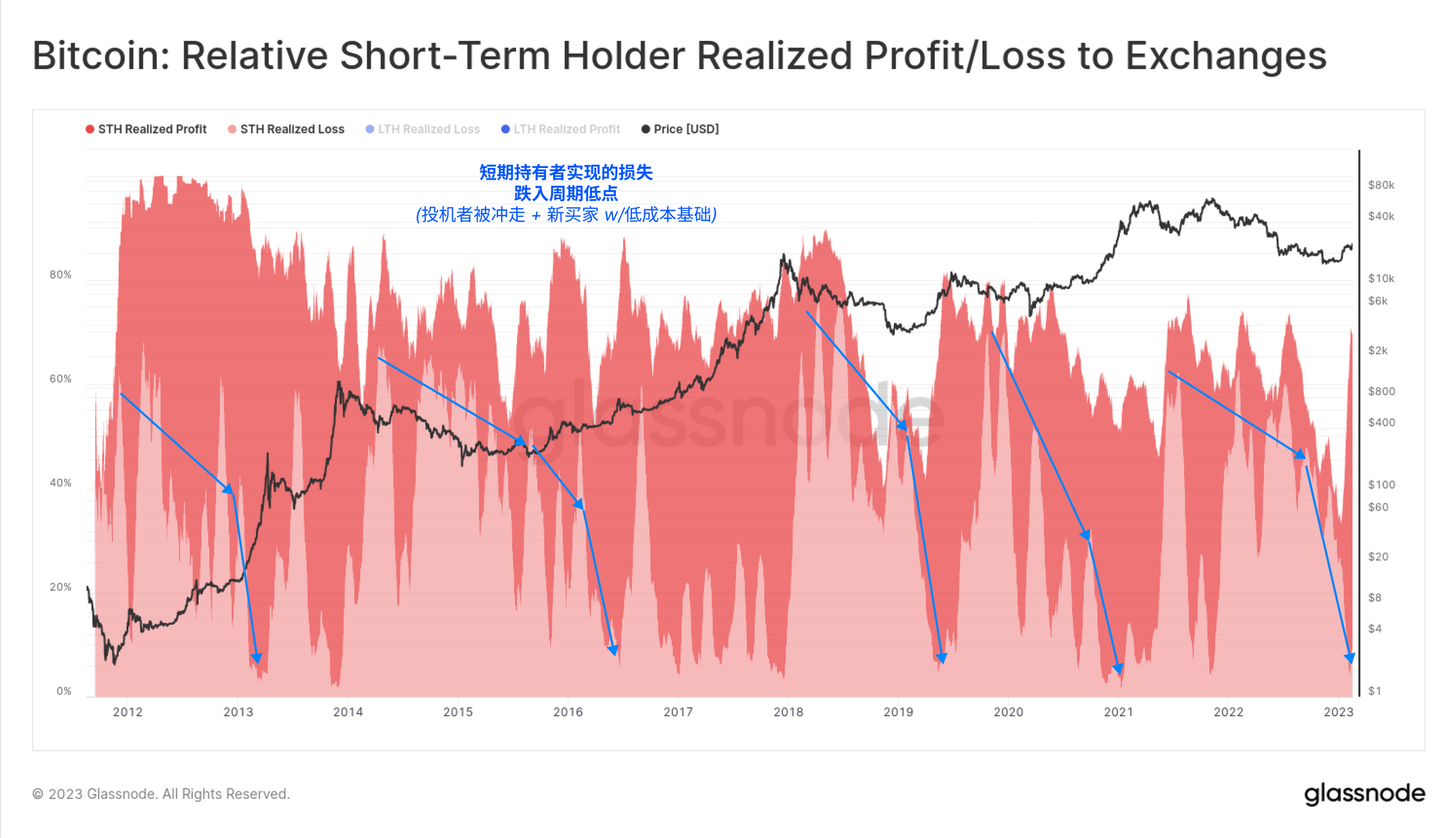 下图显示了STH群体锁定的已实现利润和损失的相对份额,特别是对发送到交易所的比特币进行过滤,以最好地模拟卖方力量。我们可以看到,在市场周期的低点,STH的相对损失有一个衰减模式,因为最后的投机者被冲走了,比特币转移到筑底的买家,现在有一个较低的成本基础。