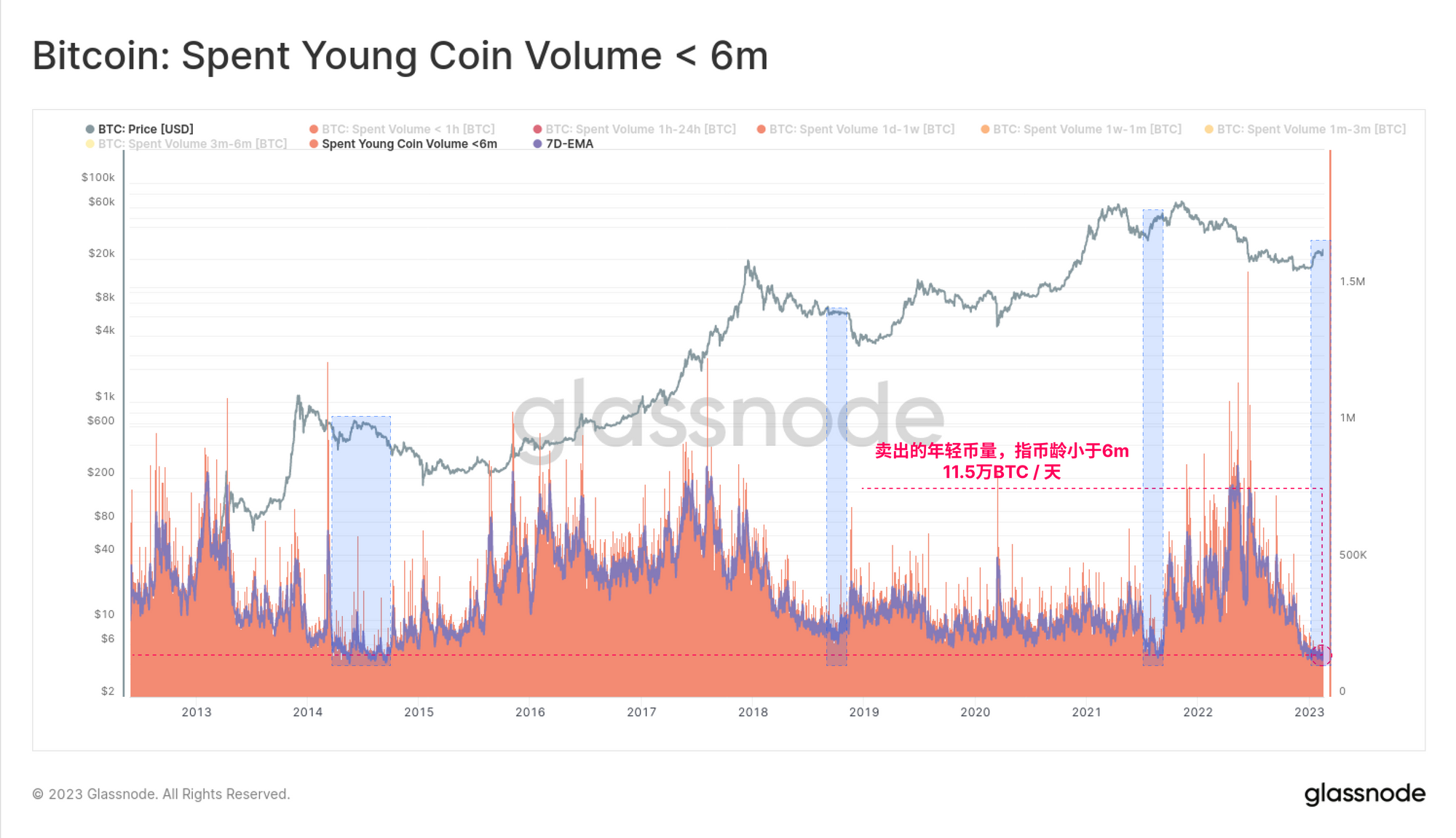 有趣的是,尽管价格行动有所提升,但转让币值的数量仍然极低。下图显示,币龄小于6个月的比特币,每天只有11.5万枚被转移(包括同一比特币的卖出)。如此低的值在历史上只出现过几次。
