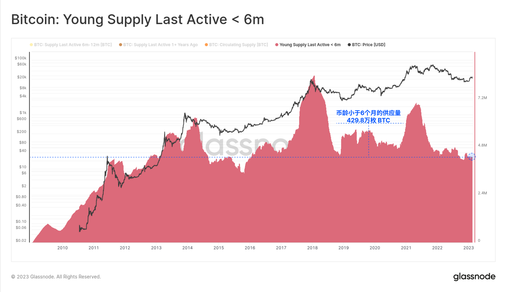 6个月以下的总供应量今年以来没有明显增加,徘徊在429.8万枚BTC左右。由于这是一个二元系统(币龄大于6个月/币龄小于6个月),这大致表明币龄大于6个月的比特币目前在总体上处于休眠状态。