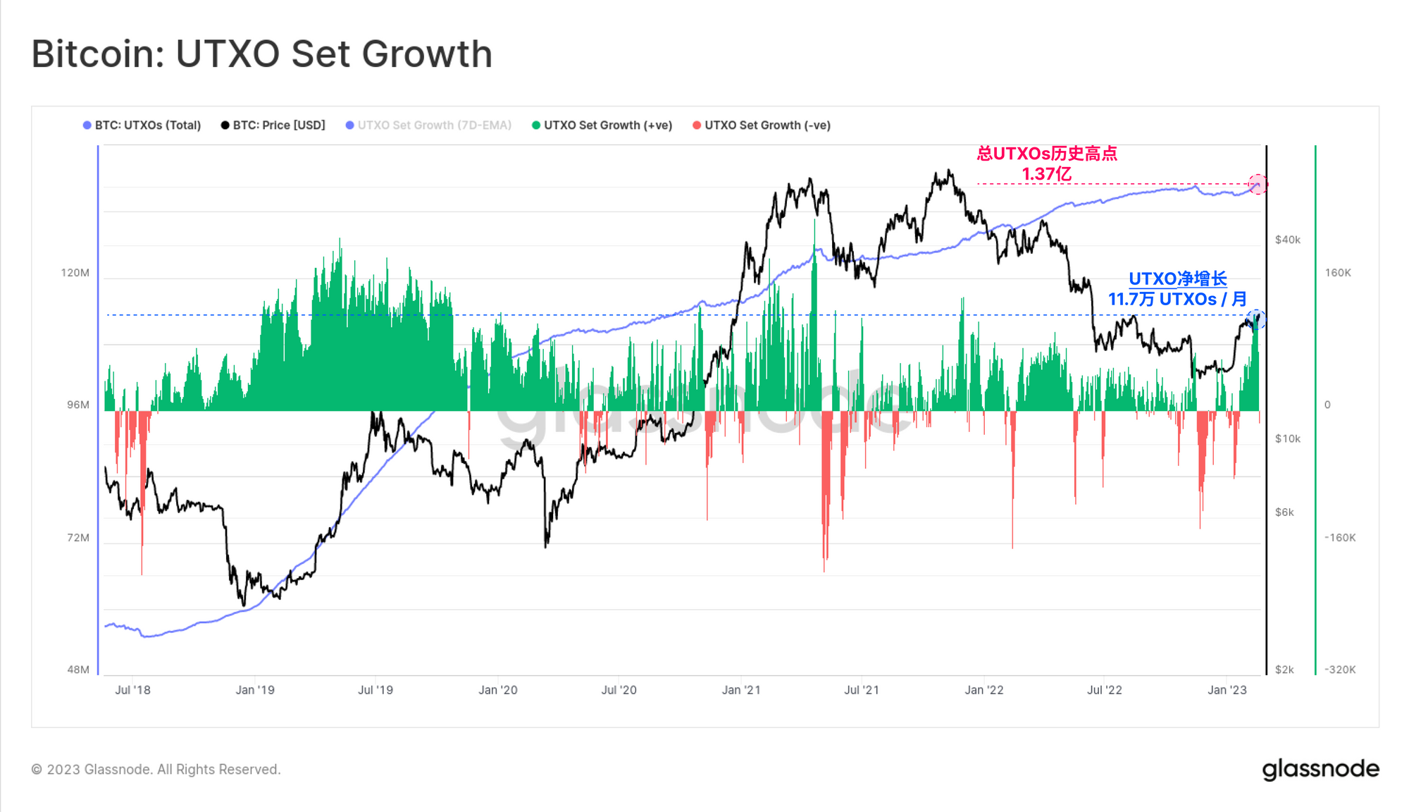 下图显示,这组UTXO的总数达到了1.37亿的历史新高。上周UTXO数量以每月11.7万的速度增加,是2022年12月以来的最高值。