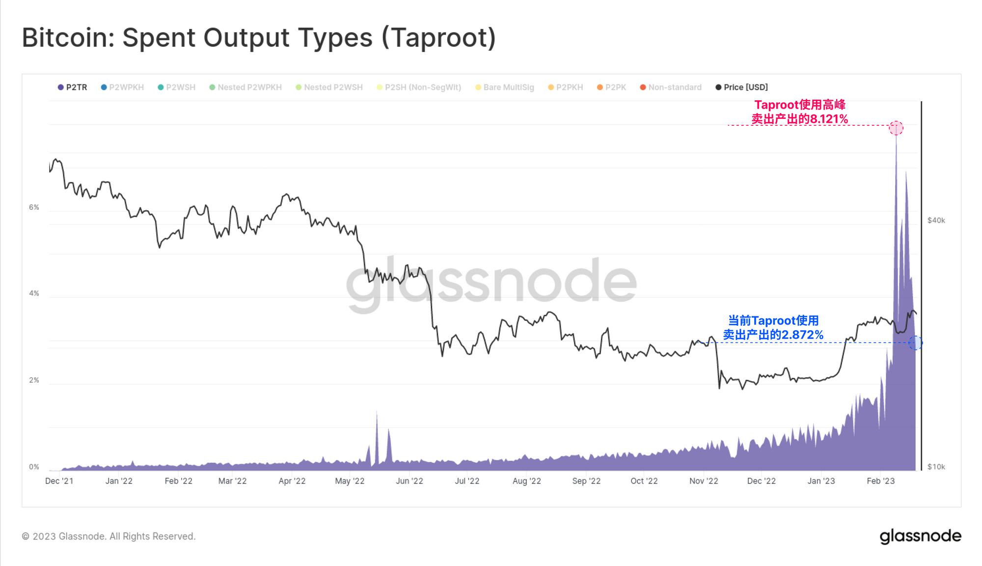 Taproot的使用率达到了历史新高,上周有8.121%的卖出产出使用了最新的比特币脚本类型。随着Inscriptions的总数超过10万,我们看到这股最初的兴奋浪潮已经开始冷却下来。自这一高峰期以来,Taproot脚本的使用率下降了65%,降至2.872%的卖出产出。