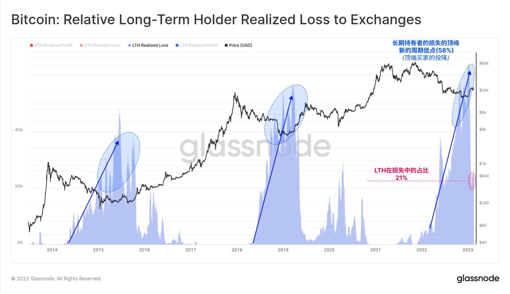 在所有发送到交易所的比特币的实现价值中,损失的LTH已经从1月中旬的58%的周期峰值急剧下降到今天的21%。在之前的每个周期中都可以看到类似的指标急剧下降,因为LTHs找到了必要的希望,再次进行了囤币。