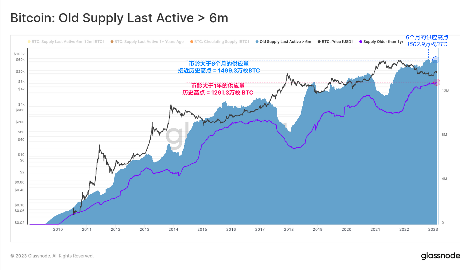 这可以通过查看旧供应量来证实,比特币至少保持了6个月的休眠状态,这非常接近于1500万枚BTC的历史新低。我们还叠加了超过1年的总供应量,本周确实跨越了历史新高,突破了1291.3万枚BTC。