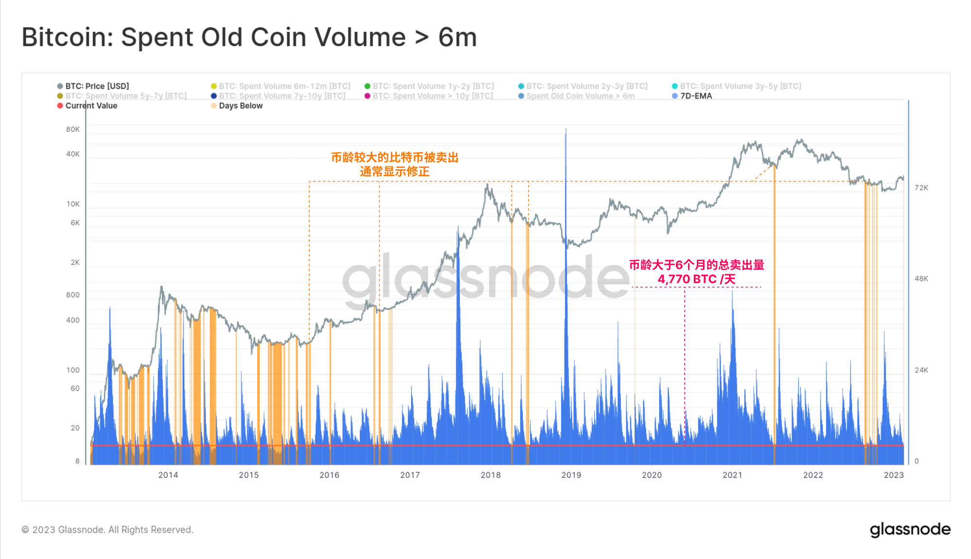 在新发布的SVAB指标的实体调整变体中,我们可以看到,所有卖出的交易量中只有4.123%的比特币的币龄超过6个月。在2018年至2022年整个熊市下跌期间,老手表现出类似的低迷卖出倾向的关键时期。
