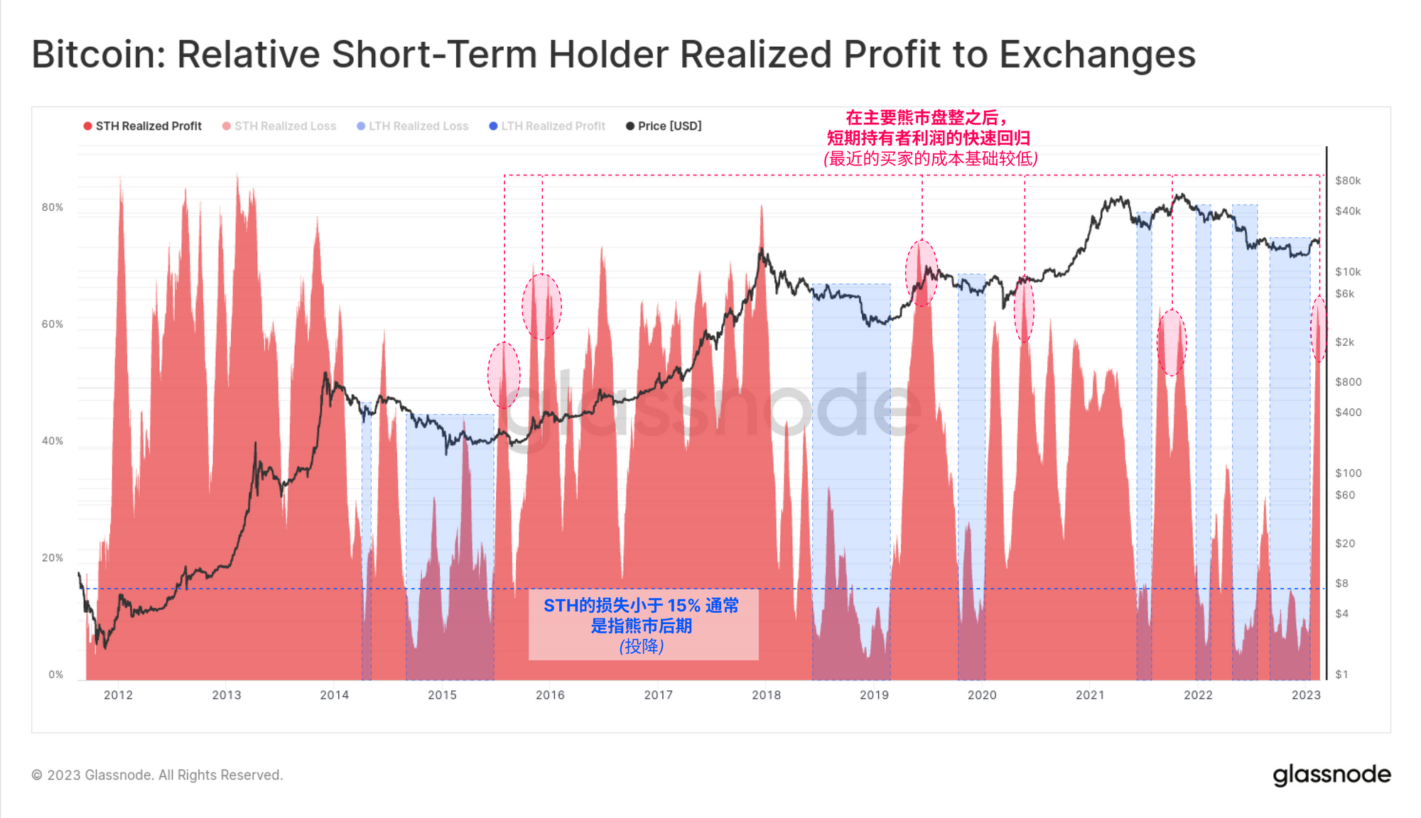 随着市场从长期的熊市🟦中恢复,这些新的STH买家在市场回升到通常为数月的底部形成范围之上时,大肆盈利。因此,STH群组几乎完全处于盈利状态,导致大部分STH卖出都是盈利的🔴。