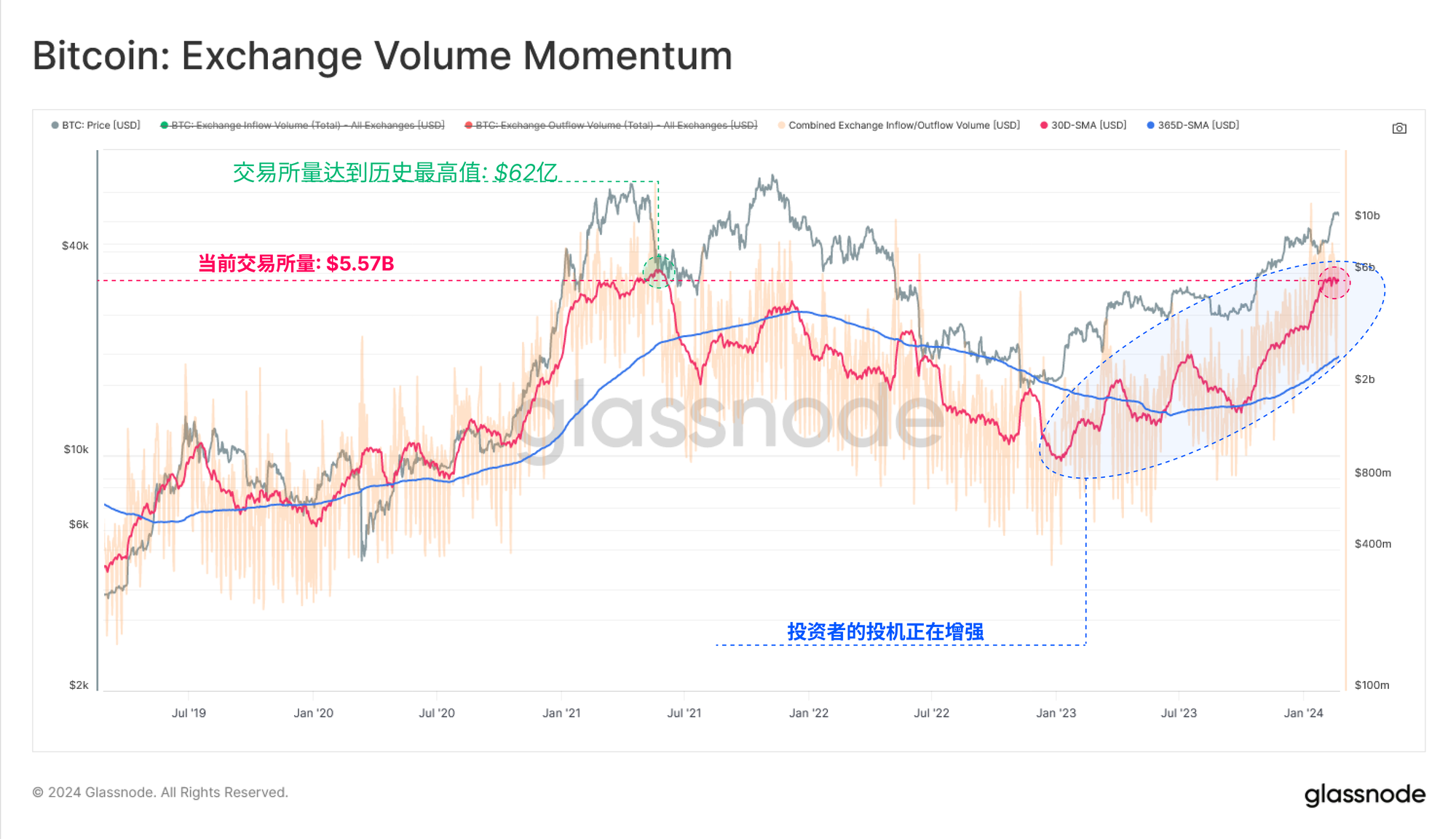 充币和提币的总量持续增长,日交易量达到惊人的57亿美元,流入和流出交易所的活动量可与2022年11月市场历史最高点期间的活动相媲美。