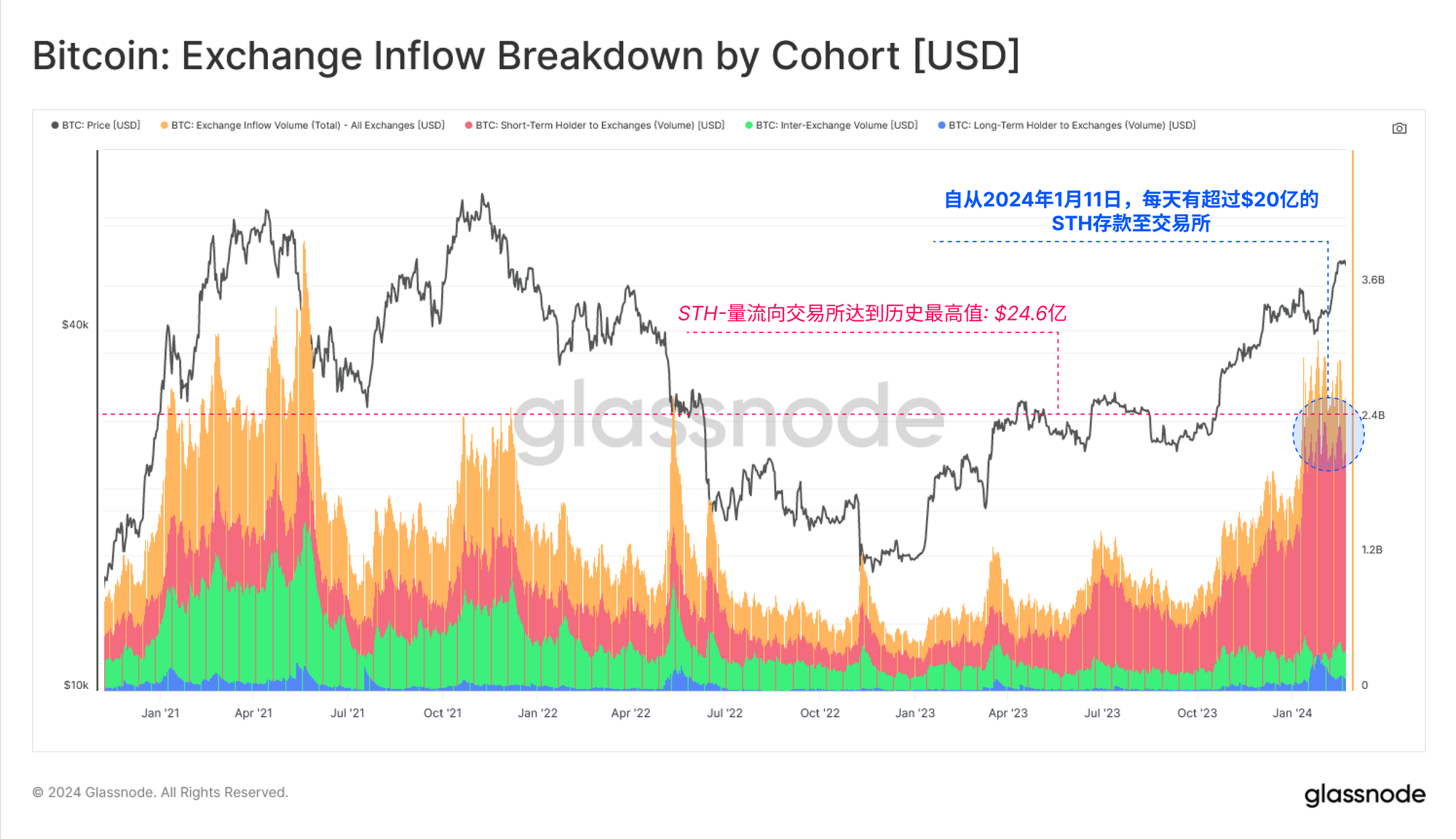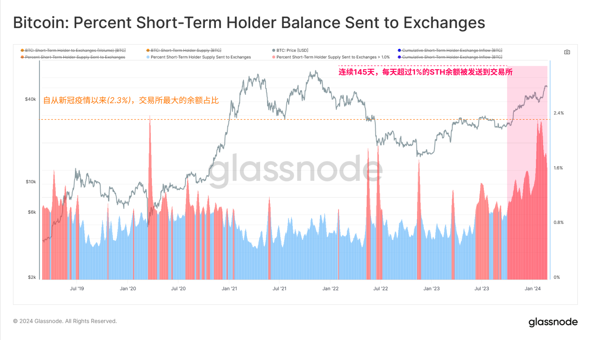 通过评估整体短期持有者余额发送到交易所的百分比,可以找到更多的汇合点。自2023年10月以来,STH群体每天存入的供应量超过1%,在最近的由ETF引导的投机中,更是达到2.36%的峰值。这是自2020年3月抛售以来最大的相对充值。