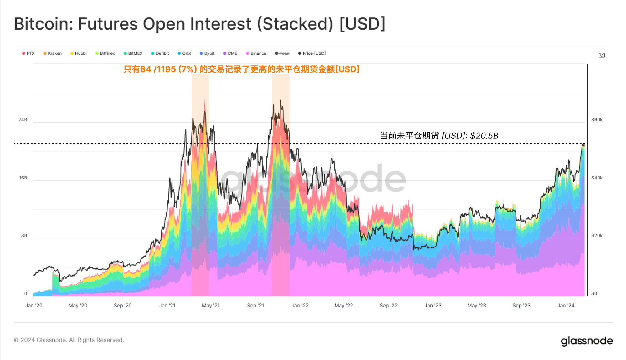 在链上流动中可见的投机活动增加的同时,我们还可以看到衍生品市场也作出了类似的响应。期货市场的总未平仓合约价值已上升至210亿美元,仅有84天(1195个交易日中的7%)记录了更高的值。