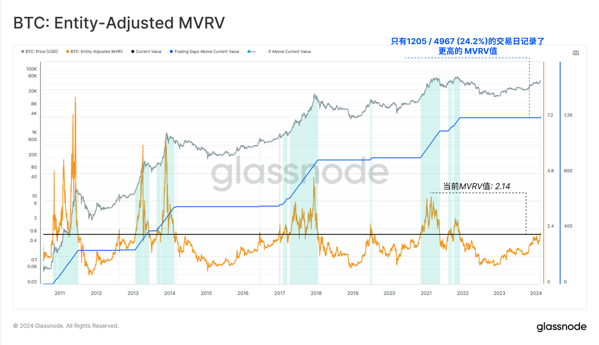 使用MVRV比率,我们能够测量这一点,这种幅度的值通常在之前牛市的早期阶段看到。在4965个交易日中,大约有1126天(22.7%)记录了更大的未实现利润。市场上方的阻力确实变得稀薄了,但这绝不是未知领域。