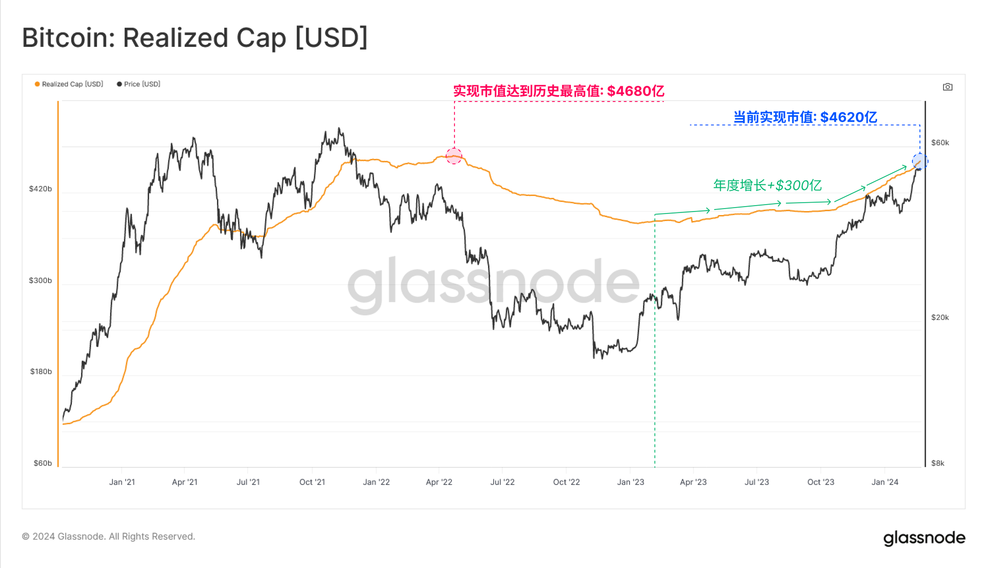 比特币价格继续在52000美元以下横盘,自2月中旬以来已保持了其大部分涨幅。支持这一表现的似乎是资产稳定且健康的资本流入,实现的市值自年初至今已增长超过300亿美元。这使得实现市值的总估值达到4600亿美元,仅比之前的历史最高点低3%。