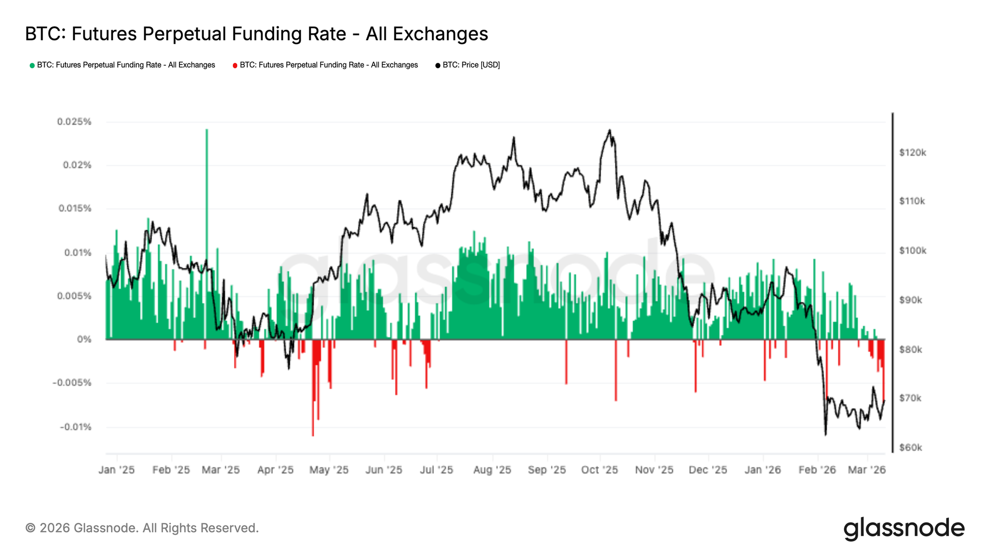永续合约资金费率在最近几个交易日果断转为负值,反映出衍生品市场中空头头寸日益占据主导地位。这一转变发生之际,比特币在大幅回调至6万美元–7万美元区域后,正处于近期区间的低端交投。