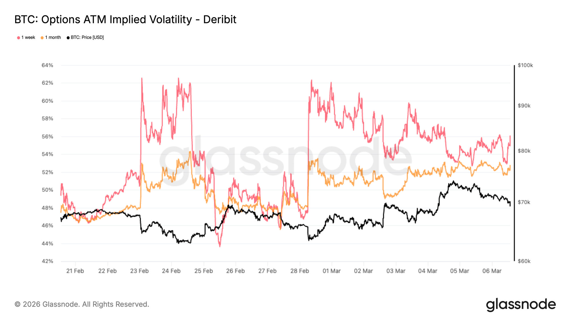 在最近的地缘政治冲击之后,比特币表现出了惊人的韧性。这种韧性目前已反映在期权市场中,短期隐含波动率已开始缓解。