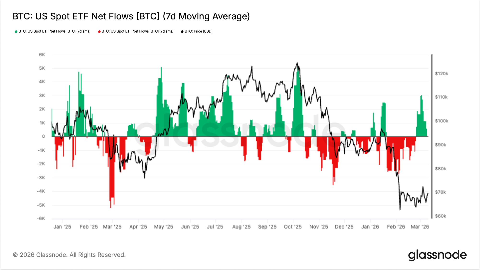 然而,在过去的一周里,资金流发生了显著转变,强劲的流入资金开始涌现,推动7天平均值坚定地回到了正值区域。这标志着自回调开始以来最显著的需求脉冲,表明随着比特币在近期低点附近趋于稳定,机构买家可能正在介入。