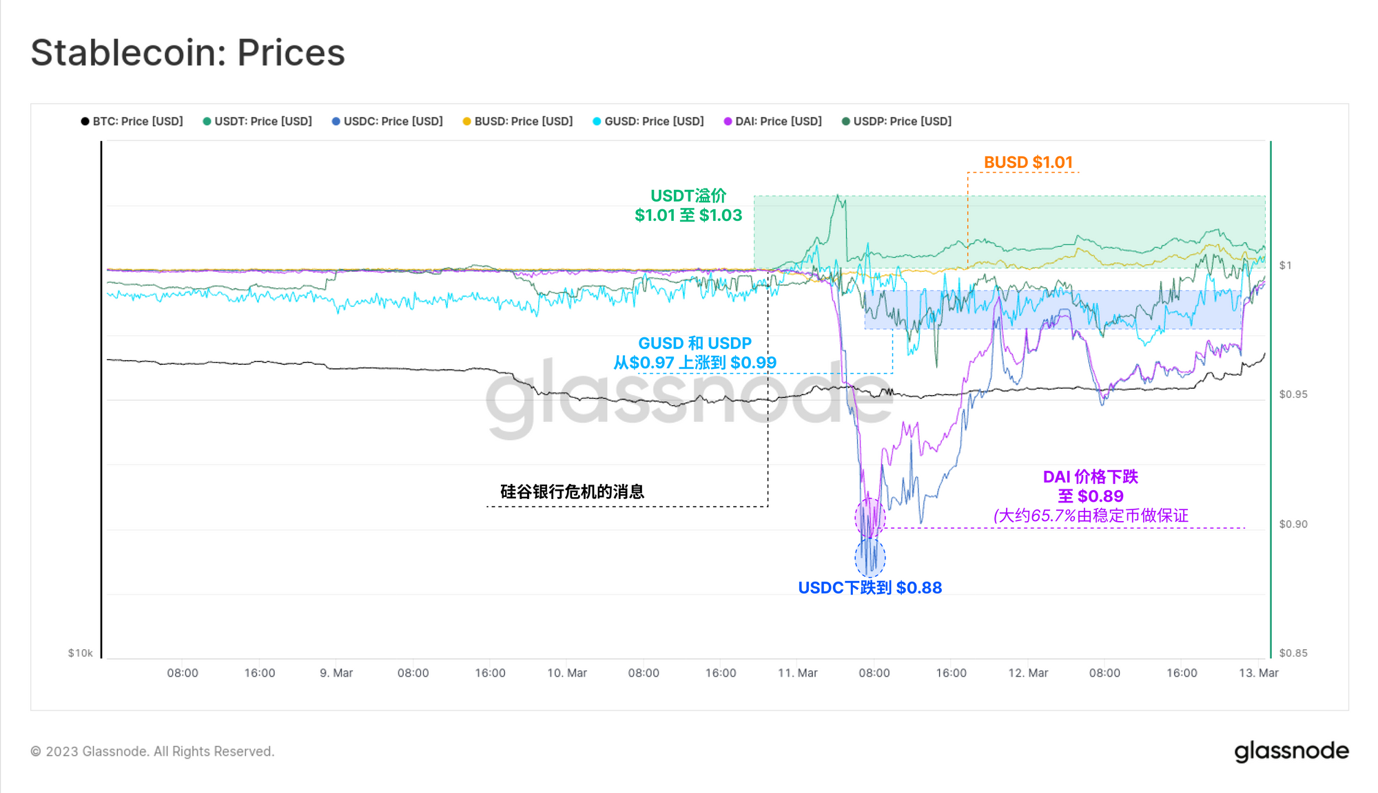 特别是Tether,在周末的大部分时间里,出现了1.01至1.03美元的溢价。具有讽刺意味的是,在人们担心美国银行业受到严格监管的情况下,Tether会被视为一个安全的避风港。