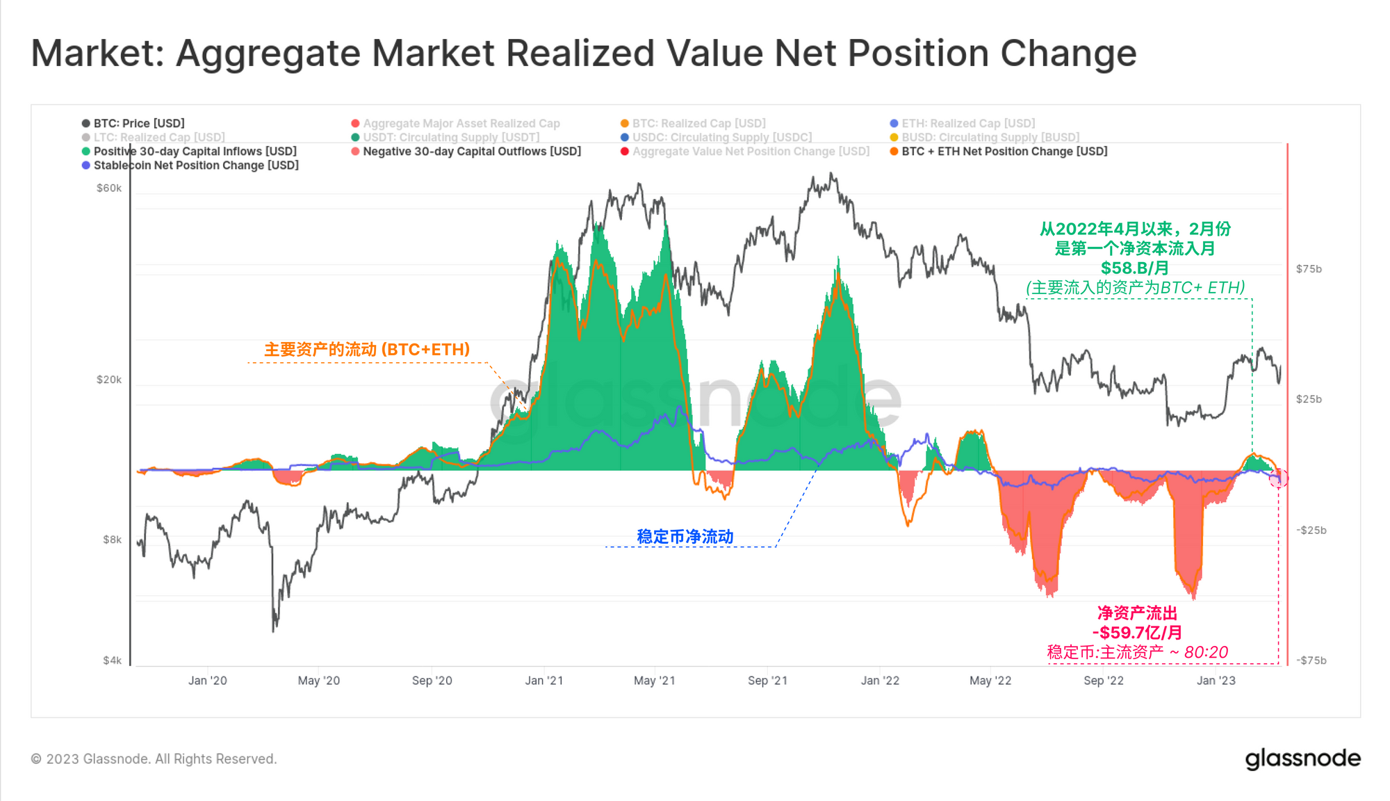 按30天变化计算,2022年4月以来,2月首次出现资金净流入,峰值为+58亿美元/月,主要由BTC和ETH引领。然而,在过去的一个月里,市场出现了-59.7亿美元的反向流出,其中80%是稳定币赎回的结果(主要是BUSD),20%是BTC和ETH的实现损失。