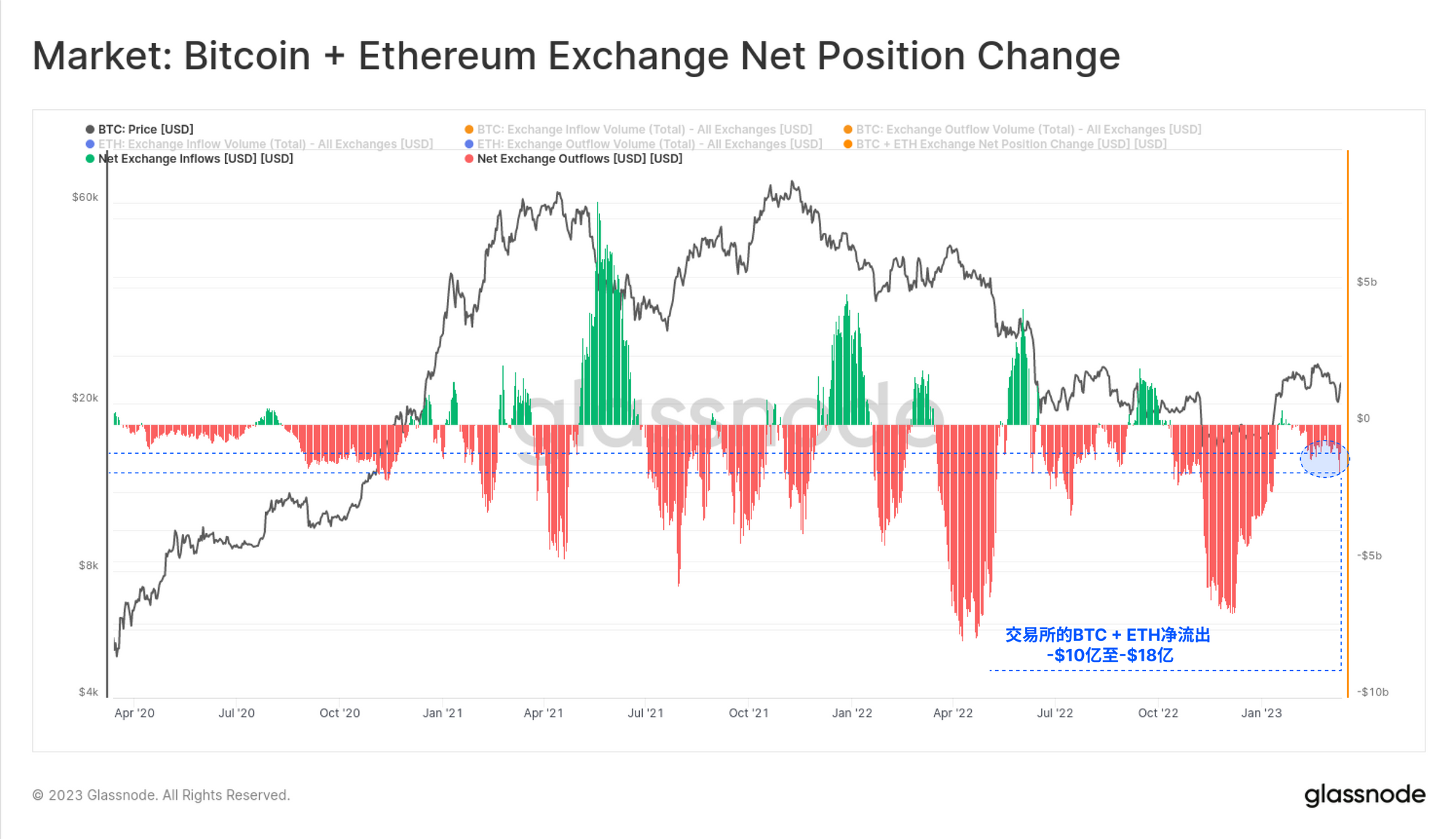 按美元计算,上个月价值超过18亿美元的BTC和ETH从交易所流出。这在相对规模上不一定很大,然而观察交易所的净提币,特别是在目前不友好的监管环境下,确实说明了投资者的信心程度,值得投资者注意。