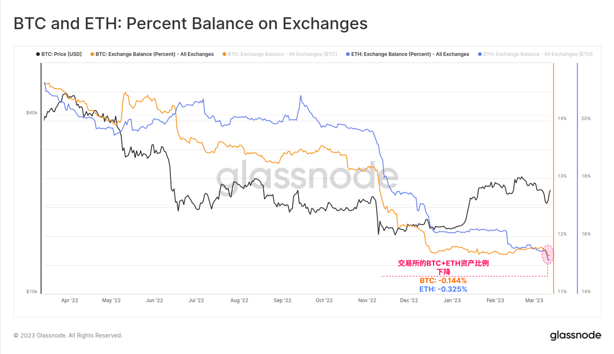 随着硅谷银行倒闭的消息传来,投资者在BTC和ETH中寻求庇护,我们监测的各交易所都出现了明显的资金外流。投资者从交易所储备中提取了流通量中大约0.144%的BTC和0.325%的ETH,显示出与 FTX崩溃类似的自我托管反应模式。