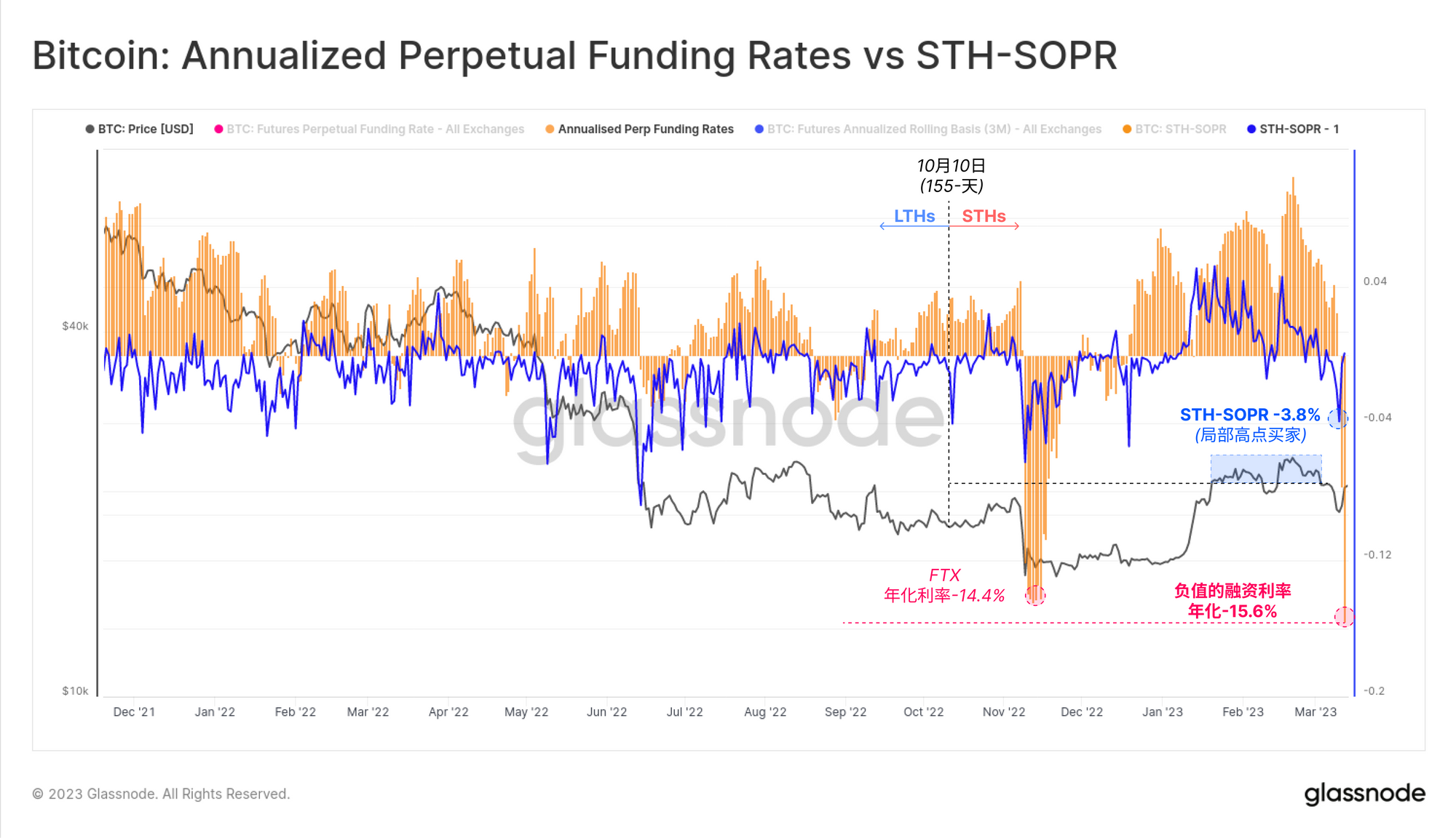 我们将以最后一张图表结束本周报,该图表将短期持有者(STHs)的链上反应与杠杆期货市场的反应重叠在一起。该图显示了STH-SOPR减去1🔵,与年化期货融资率🟠相比较,我们有以下发现: