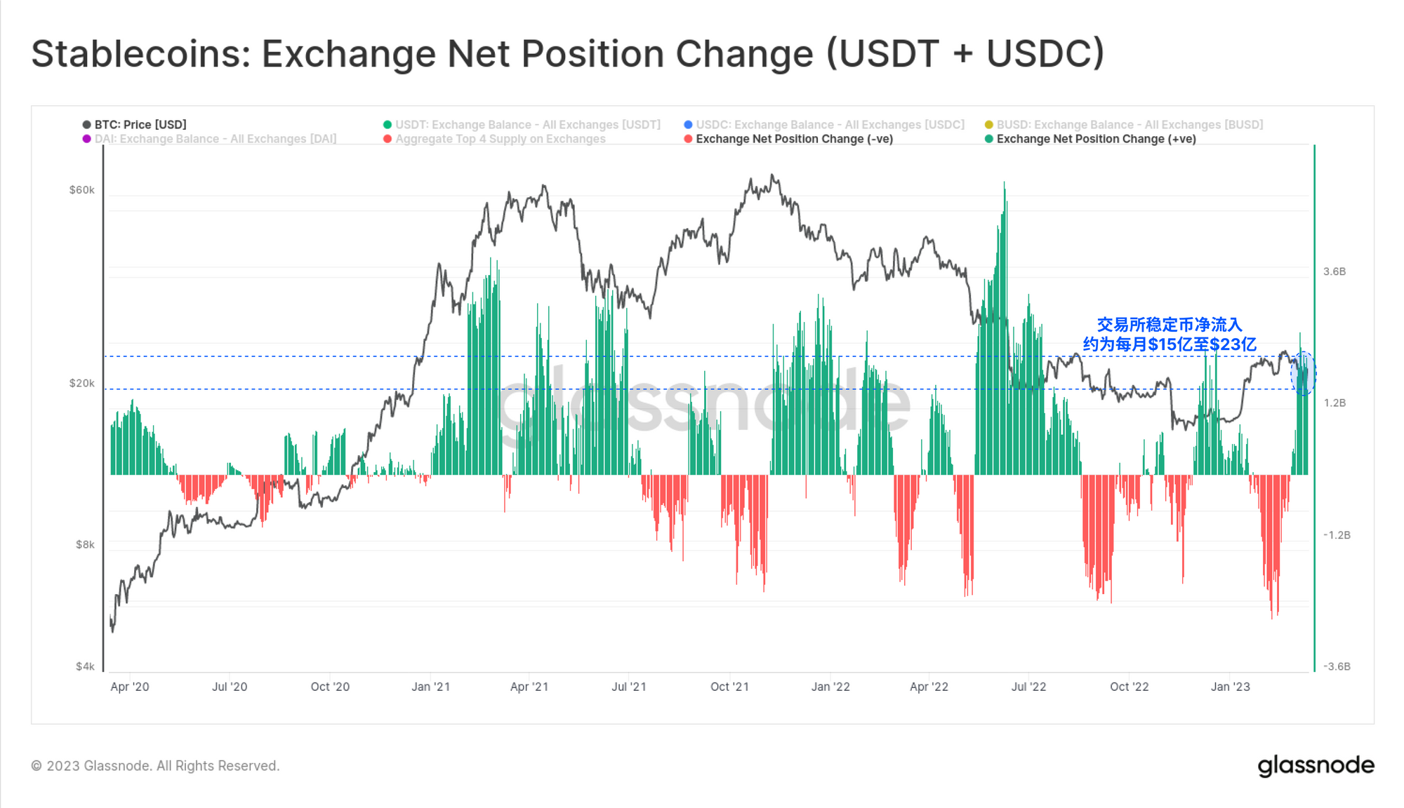 另一方面,两大稳定币每月净流入交易所的资金约为18亿至23亿美元。值得注意的是,BUSD以每月-68亿美元的惊人速度流出交易所,抵消了上面的两种稳定币的流入。因此,很可能有一定程度的"稳定币转换 "正在发生。