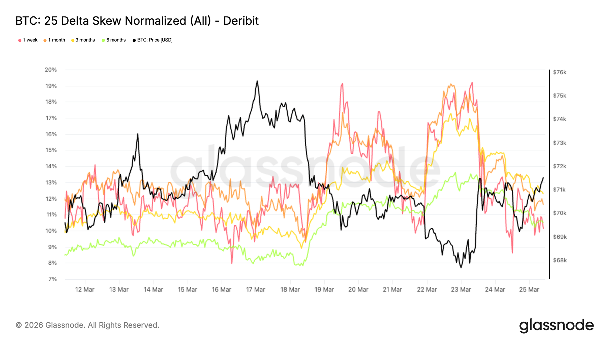 此后,偏度有所回落,但仍维持在较高水平,并在不同期限之间呈现紧密聚集,约在 10% 至 12% 区间。曲线整体的压缩表明,对下行保护的偏好并不仅限于前端,而是反映出市场参与者普遍存在且较为一致的对冲倾向。