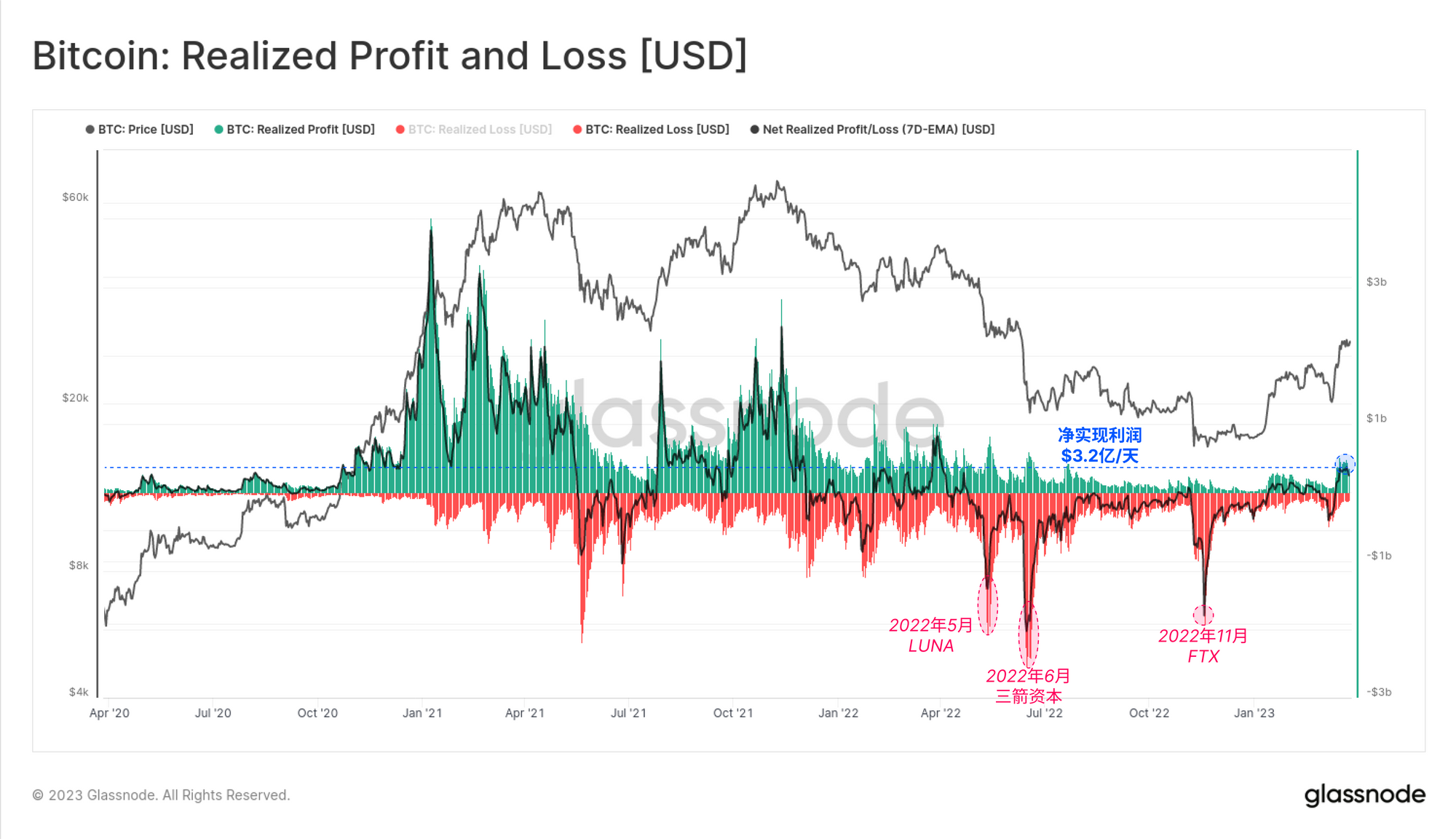 总的来说,总共有3.2亿美元/天的净利润被市场锁定在卖出的币上。这是自2022年5月以来最大的净利润获取,就在LUNA-UST项目崩溃之前。我们注意到,已实现利润的规模仍然远远低于典型的牛市水平。