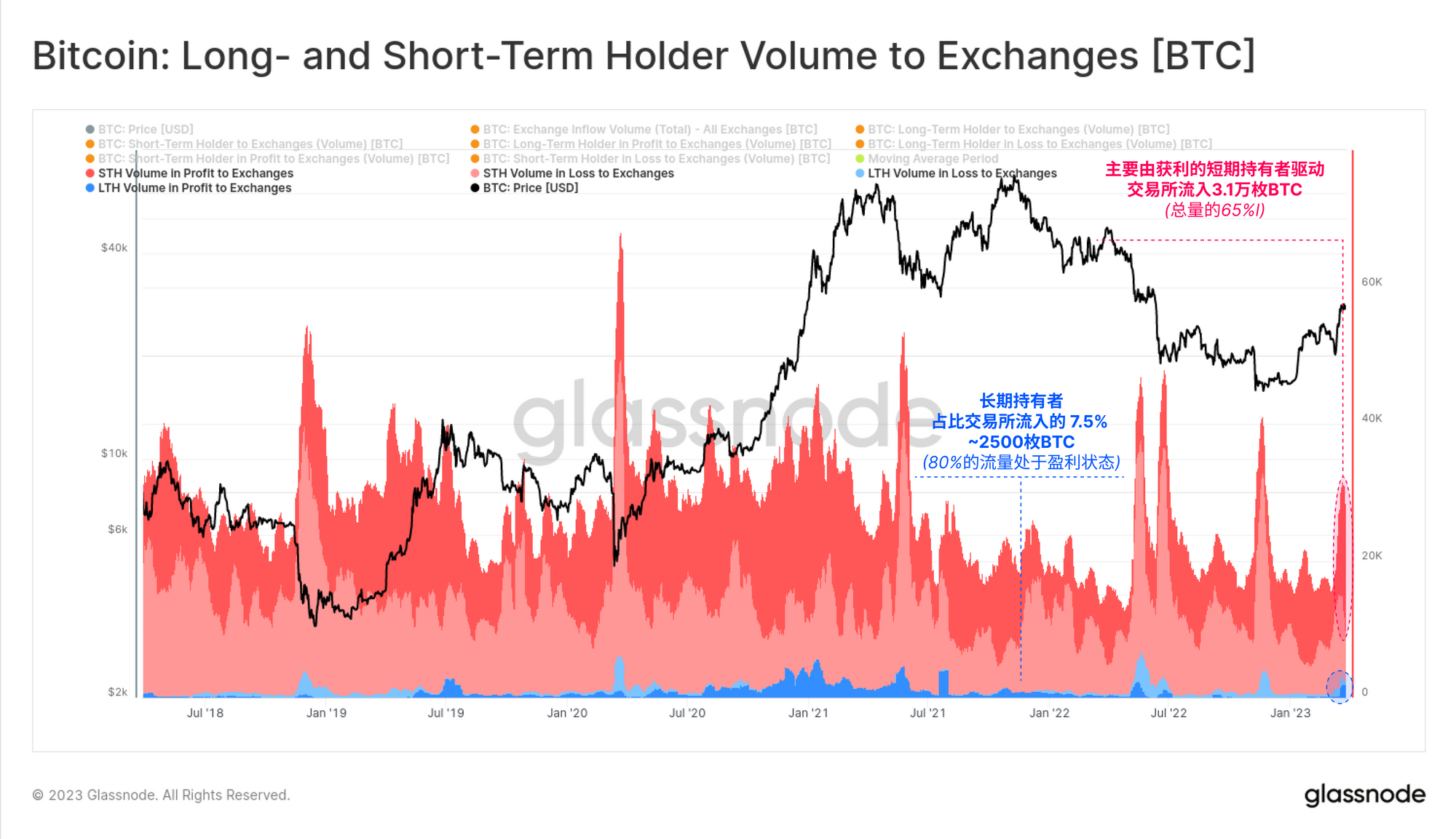 我们还可以根据长期或短期持有者发送交易所的比特币分类,探索哪些群组正在卖出获利。这两个群体都出现了向交易所发送比特币的上升趋势,本周达到了31000枚比特币的峰值。