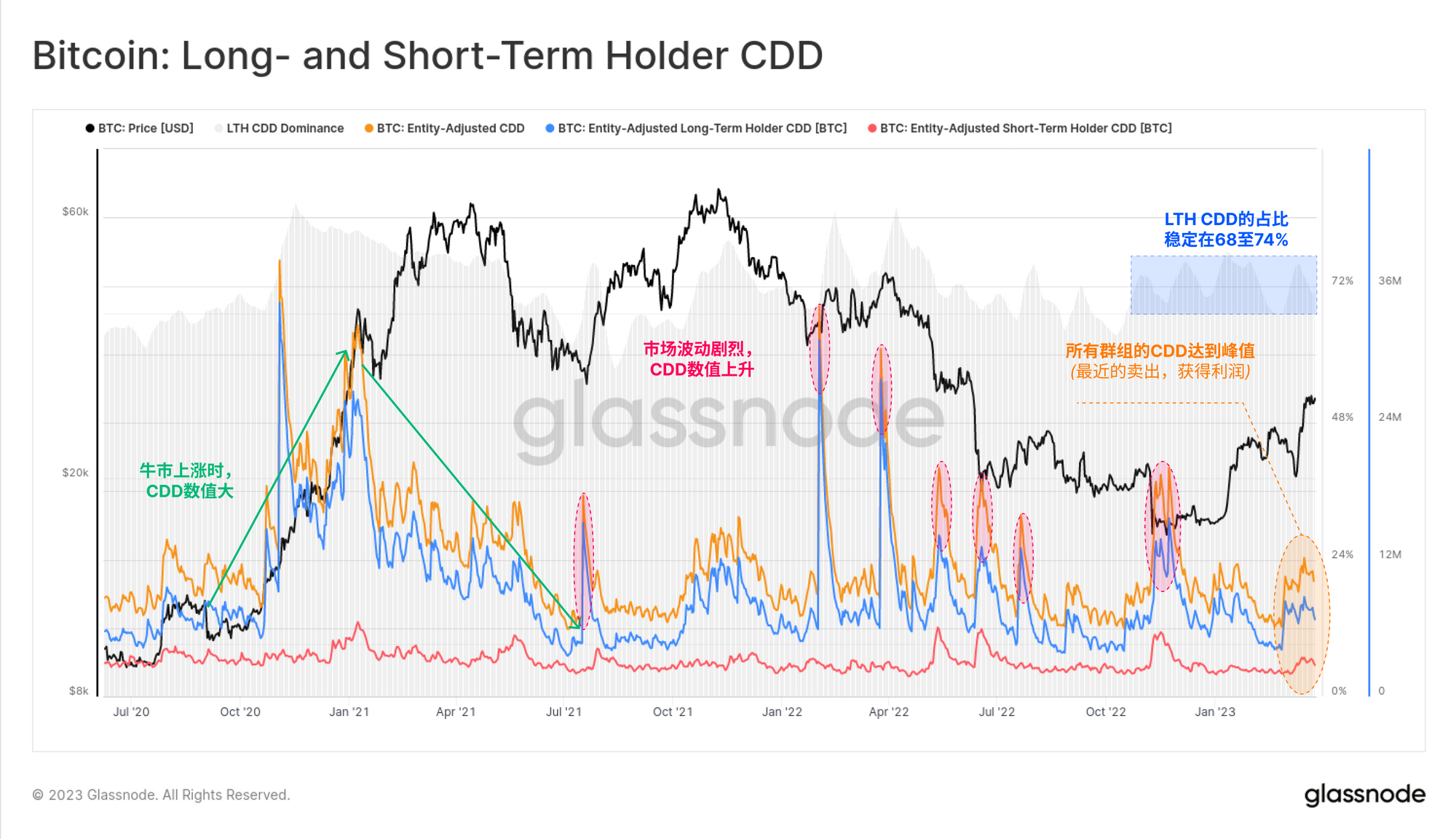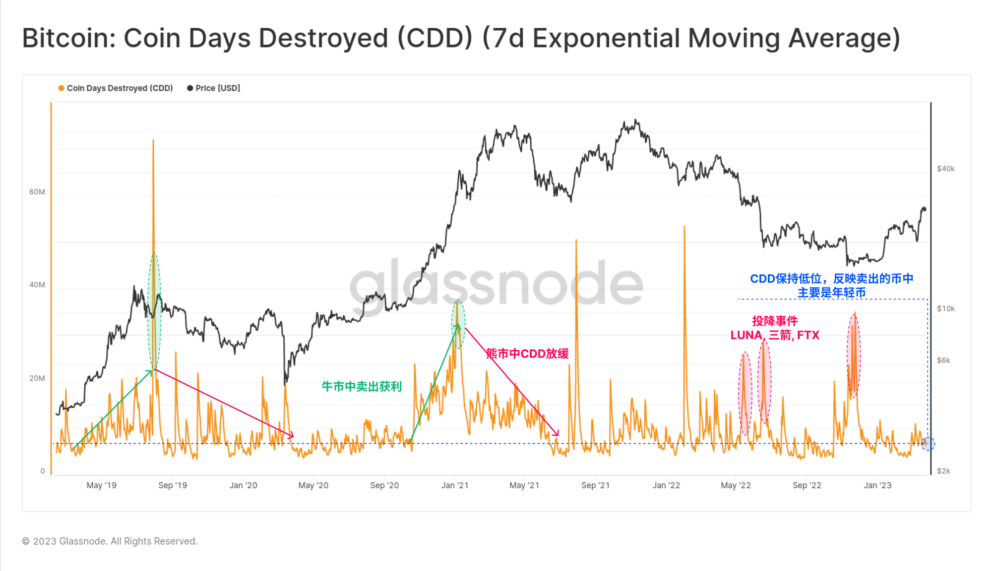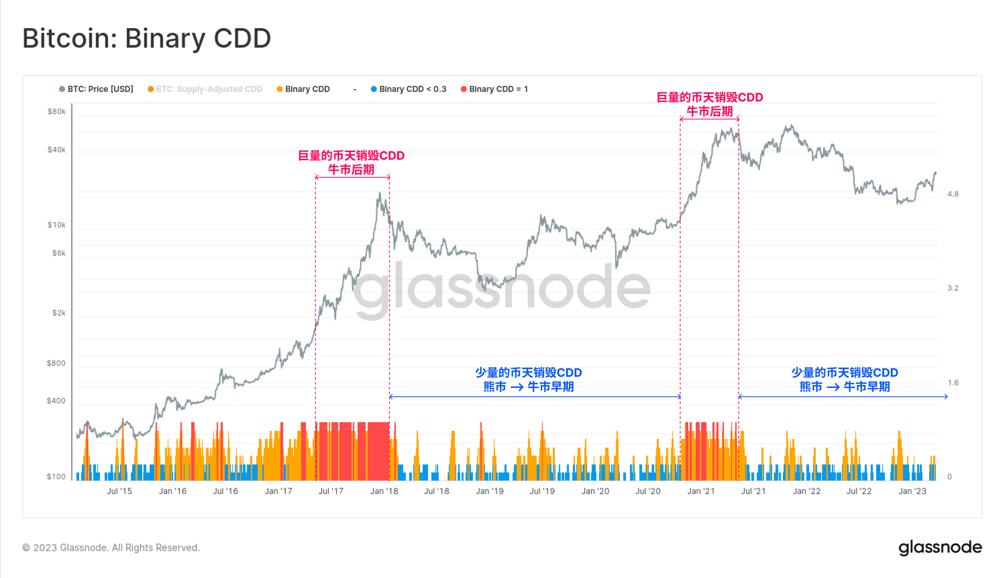 衡量币龄的主要指标是币天销毁指数(CDD),它反映了每天的 "投资者持有时间 "的数量。在过去的周期中,我们一般可以将CDD的上升描述为两类: