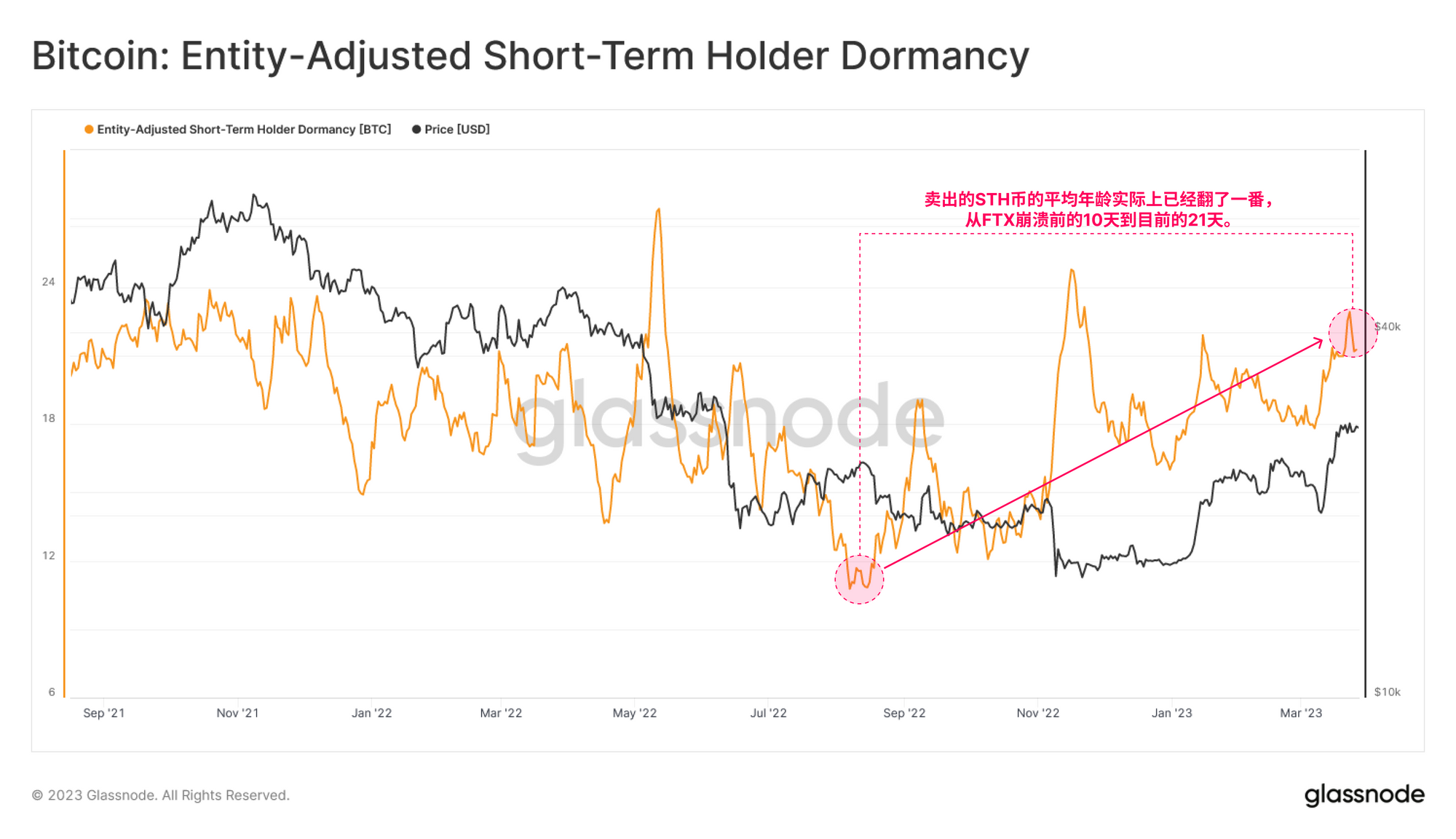 放大到短期持有者,卖出的STH比特币的平均年龄也增加了,从FTX失败前几个月的约10天,到今天的21天,实际上增加了一倍。这进一步证明了短期持有者的论点,他们在周期低点附近积累了比特币,却是最近获利的主要参与者。